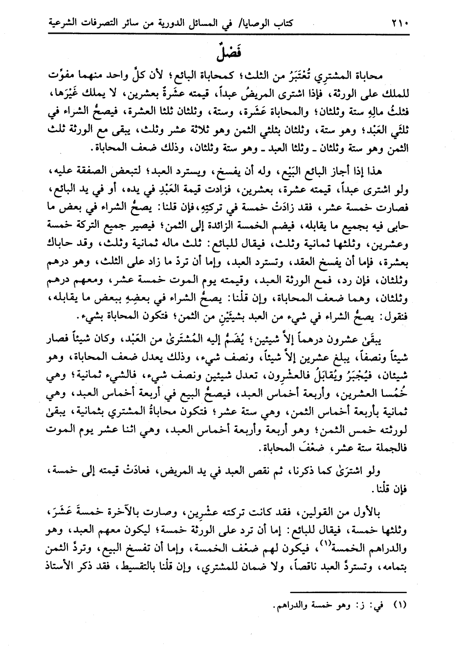 يبقَى عشرون درهماً إلاَّ شيئين؛ يُضَمُّ إليه المُشتَرى من العَبْد، وكان شيئاً فصار شيئاً ونصفاً، يبلغ عشرين إلاَّ شيئاً، ونصف شيء، وذلك يعدل ضعف المحاباة، وهو شيئان، فيُجْبَرُ وُيقابَلُ فالعشْرِون، تعدل شيئين ونصف شيء، فالشيء ثمانية؛ وهي خُمُسا العشرين، وأربعة أخماس العبد، فيصحُّ البيع في أربعة أخماس العبد، وهي ثمانية بأربعة أخماس الثمن، وهي ستة عشر؛ فتكون محاباةُ المشتري بثمانية، يبقى لورثته خمس الثمن؛ وهو أربعة وأربعة أخماس العبد، وهي اثنا عشر يوم الموت فالجملة ستة عشر، ضعْفَ المحاباة.