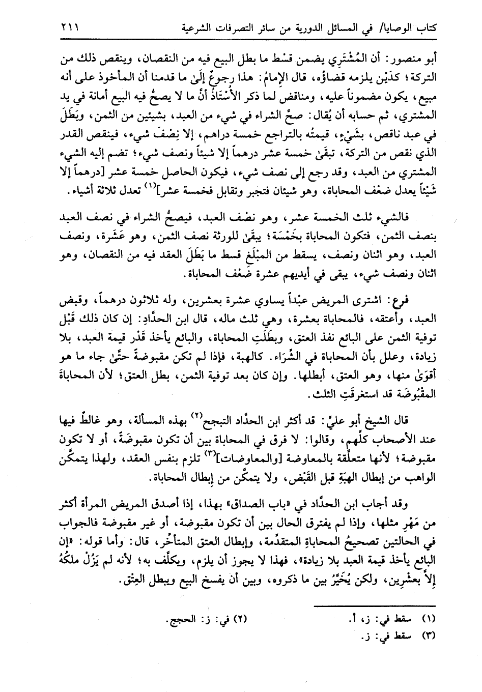 أبو منصور: أن المُشْتَرِي يضمن قسْط ما بطل البيع فيه من النقصان، وينقص ذلك من التركة؛ كدَيْن يلزمه قضاؤُه، قال الإِمامُ: هذا رجوعٌ إلَى ما قدمنا أن المأخوذ على أنه مبيع، يكون مضموناً عليه، ومناقض لما ذكر الأُسْتَاذُ أنَّ ما لا يصحُّ فيه البيع أمانة في يد المشتري، ثم حسابه أن يُقال: صحَّ الشراء في شيء من العبد، بشيئين من الثمن، وبَطَلَ في عبد ناقص، بشَيْءٍ، قيمته بالتراجع خمسة دراهم، إلا نِصْفَ شيء، فينقص القدر الذي نقص من التركة، تبقَى خمسة عشر درهماً إلا شيئاً ونصف شيء؛ تضم إليه الشيء المشتري من العبد، وقد رجع إلى نصف شيء، فيكون الحاصل خمسة عشر [درهماً إلا شَيْئاً يعدل ضعْف المحاباة، وهو شيئان فتجبر وتقابل فخمسة عشر] (¬1) تعدل ثلاثة أشياء.