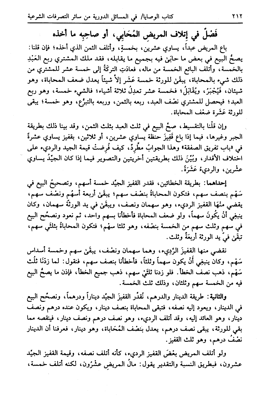 إحداهما: بطريقة الخطائين، فقدر القفيز الجيِّد خمسة أسهم، وتصحيحُ البيع في سَهْم بنصف سهم، فتكون المحاباةُ بنصْف سهم؛ يبقَى أربعة أسهُمٍ ونصْف سهم، يقضي منْهَا القفيز الرديء، وهو سهمان ونصف، ويبقَى في يد الورثة سهمان، وكان ينبغِي أنْ يكُونَ سهماً، ولو ضعف المحاباة فأخطأنا بسهم واحد، ثم نعود ونصحَّح البيع في سهمٍ وثلث سهم من الخمسة بنصْفه، وهو ثلثا سهْم؛ فتكون المحاباةُ بثلثَي سهم، تبقَى في يد الورثة أربعَةٌ وثلث.