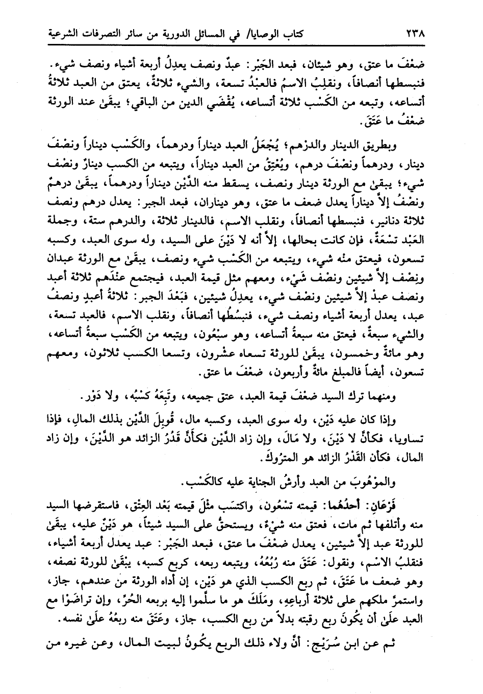 وبطريق الدينار والدرْهم؛ يُجْعَلُ العبد ديناراً ودرهماً، والكَسْب ديناراً ونصْفَ دينار، ودرهماً ونصْفَ درهم، ويُعْتِقُ من العبد ديناراً، ويتبعه من الكسب دينارٌ ونصْف شيء؛ يبقى مع الورثة دينار ونصف، يسقط منه الدَّيْن ديناراً ودرهماً، يبقَى درهمٌ ونصْفُ إلاَّ ديناراً يعدل ضعف ما عتق، وهو ديناران، فبعد الجبر: يعدل درهم ونصف ثلاثة دنانير، فنبسطها أنصافاً، ونقلب الاسم، فالدينار ثلاثة، والدرهم ستة، وجملة العَبْد تسْعَةٌ، فإن كانت بحالها، إلاَّ أنه لا دَيْنَ على السيد، وله سوى العبد، وكسبه تسعون، فيعتق منه شيء، ويتبعه من الكَسْب شيء ونصف، يبقَى مع الورثة عبدان ونِصْف إلاَّ شيئين ونصْف شَيْء، ومعهم مثل قيمة العبد، فيجتمع عنْدَهم ثلاثة أعبد ونصف عبدْ إلاَّ شيئين ونصْف شيء، يعدِلُ شيئين، فبَعْدَ الجبر: ثلاثةُ أعبدٍ ونصفُ عبد، يعدل أربعة أشياء ونصف شيء، فنبسُطُها أنصافاً، ونقلب الاسم، فالعبد تسعة، والشيء سبعةٌ، فيعتق منه سبعةُ أتساعه، وهو سبْعُون، ويتبعه من الكَسْب سبعةُ أتساعه، وهو مائةٌ وخمسون، يبقَى للورثة تسعاه عشْرون، وتسعا الكسب ثلاثون، ومعهم تسعون، أيضاً فالمبلغ مائةٌ وأربعون، ضعْفَ ما عتق.