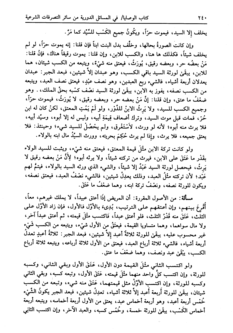 مسألة: من الأصول المقررة: أن المريض إذَا أعتق عبيداً، لا يملك غيرهم، معاً، أُقْرعَ بينهم، وإن أعتقهم على الترتيب، بُدِئَ بالأوَّل فالأول، فإن زاد الأوَّل على الثلث، عَتَقَ منه قَدْرُ الثلث، فلو أعتق عبداً، فاكتسب مثْلَ قيمته، ثم أعتق عبداً آخر، ولا مال سواهما، وهما متساويا القيمة، فيعتَقُ من الأول شيْء، ويتبعه من الكسب شَيْء غير محسوب عليه، يبقَى للورثة ثلاثةٌ أعبد إِلاَّ شيئين، فبعد الجبر: ثلاثةُ أعبدٍ تعدلُ أربعة أشياء، فالشيء ثلاثة أرباع العبد، فيعتق من الأول ثلاثة أرباعه، ويتبعه ثلاثة أرباع الكسب، يبْقَى عبد ونصف، وهما ضعْفَ ما عتق.
