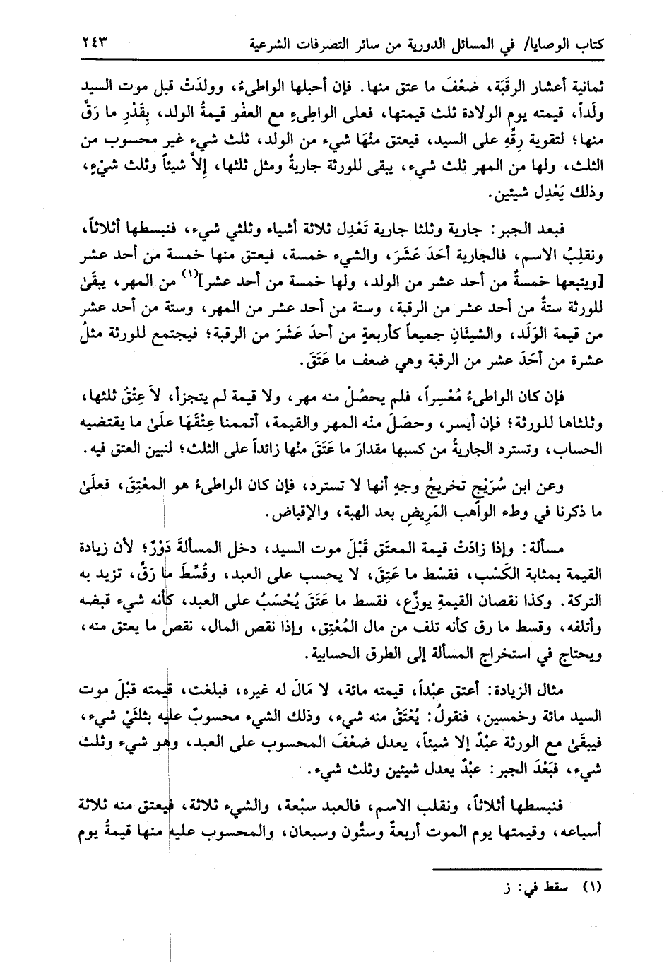 مثال الزيادة: أعتق عبْداً، قيمته مائة، لا مَالَ له غيره، فبلغت، فيمته قبْلَ موت السيد مائة وخمسين، فنقولُ: يُعْتَقُ منه شيء، وذلك الشيء محسوبٌ عليه بثلثَيْ شيء، فيبقَى مع الورثة عبْدٌ إلا شيئاً، يعدل ضعْفَ المحسوب على العبد، وهو شيء وثلث شيء، فبَعْدَ الجبر: عبْدٌ يعدل شيئين وثلث شيء.