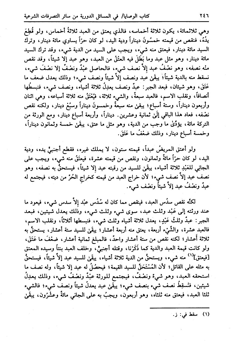 وهي ثلاثمائة، يكون ثلاثة أخماسه، فالذي يعتق من العبد ثلاثةُ أخماس، ولو قُطِعَ يدُهُ، فنقص من قيمته خمسُونَ دينارًا ودية اليد، لو كان حرّاً يساوي مائة دينار، وترك السيد مائة دينار، فيعتق منه شيء، ويجب على السيد من الدية شيء، وقد ترك السيد مائة دينار، وهو مثل عبد وما بَطَلَ فيه العتْقُ من العبد، وهو عبد إلا شيئاً، وقد نقص منْه نصفه، وهو نصْفُ عبد إِلاَّ نصف شيء، فالحاصل عبْدٌ ونصْفٌ إلا نصْفَ شيء، نسقط منه بالدية شيئاً؛ يبقَى عبد ونصف إلاَّ شيئاً ونصف شيء؛ وذلك يعدل ضعف ما عَتَقَ، وهو شيئان، فبعد الجبر: عبدٌ ونصف يعدِلُ ثلاثة أشياء، ونصف شيء، فنبسطُها أنصافاً، ونقلب الاسم، فالعبد سبعةٌ، والشيء ثلاثة، فيُعْتَقُ منه ثلاثة أسباعه، وهي اثنان وأربعون ديناراً، وستة أسباع؛ يبقى منه سبعةٌ وخمسونَ ديناراً وسبُعْ دينار، ولكنه نقص نصْفه، فعاد هذا الباقي إلَى ثمانية وعشرين. ديناراً، وأربعة أسباع دينار، ومع الورثة من التركة مائة، يؤدَّى ما وجب من الدية، وهو مثل ما عتق، يبقَى خمسة وثمانون ديناراً، وخمسة أسباع دينار، وذلك ضعْفُ ما عَتَقَ.