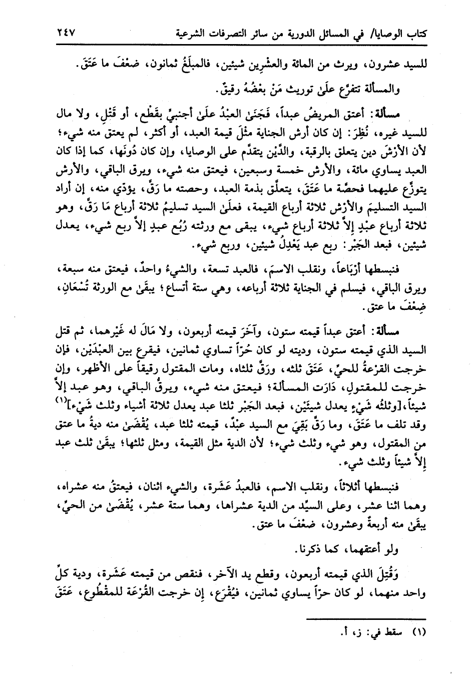 فنبسطها أثلاثاً، ونقلب الاسم، فالعبدُ عَشَرة، والشيء اثنان، فيعتقُ منه عشراه، وهما اثنا عشر، وعلى السيِّد من الدية عشراها، وهما ستة عشر، يُقْضَى من الحيَّ، يبقَى منه أربعةٌ وعشرون، ضعْفَ ما عتق.