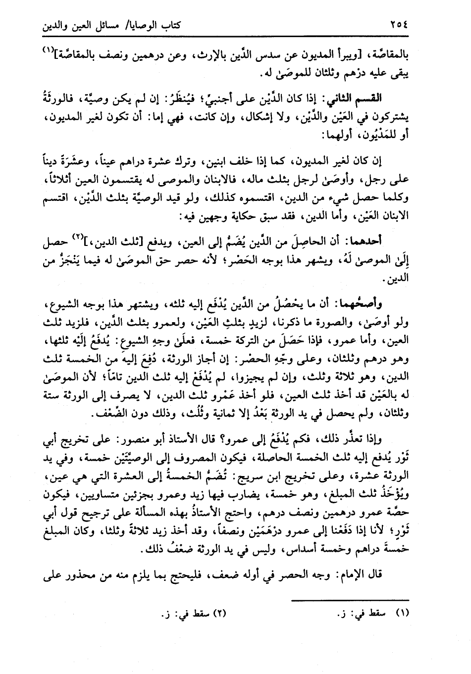القسم الثاني: إذا كان الدَّيْن على أجنبيِّ؛ فيُنظَرُ: إن لم يكن وصيَّة، فالورثَةُ يشتركون في العَيْن والدَّيْن، ولا إشكال، وإن كانت، فهي إما: أن تكون لغير المديون، أو للمَدْيُون، أولهما: