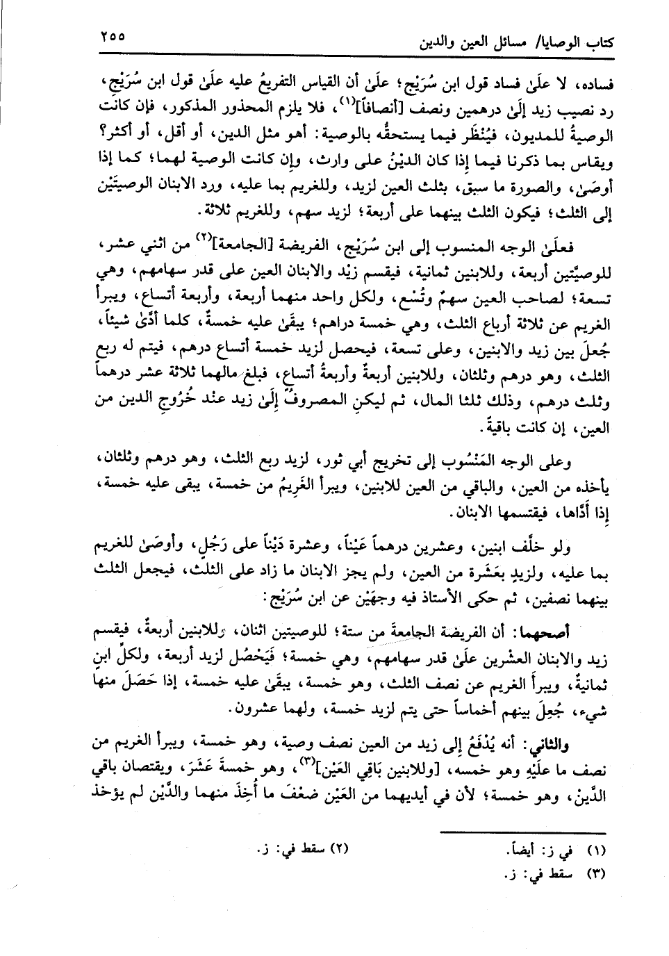 فعلَى الوجه المنسوب إلى ابن سُرَيْج، الفريضة [الجامعة] (¬2) من اثني عشر، للوصيَّتين أربعة، وللابنين ثمانية، فيقسم زيْد والابنان العين على قدر سهامهم، وهي تسعة؛ لصاحب العين سهمٌ وتُسْع، ولكل واحد منهما أربعة، وأربعة أتساع، ويبرأ الغريم عن ثلاثة أرباع الثلث، وهي خمسة دراهم؛ يبقَى عليه خمسةٌ، كلما أدَّى شيئاً، جُعلَ بين زيد والابنين، وعلى تسعة، فيحصل لزيد خمسة أتساع درهم، فيتم له ربع الثلث، وهو درهم وثلثان، وللابنين أربعةٌ وأربعةُ أتساعٍ، فبلغ مالهما ثلاثة عشر درهماً وثلث درهم، وذلك ثلثا المال، ثم ليكنِ المصروفُ إلى زيد عنْد خُرُوجِ الدين من العين، إن كانت باقيةً.
