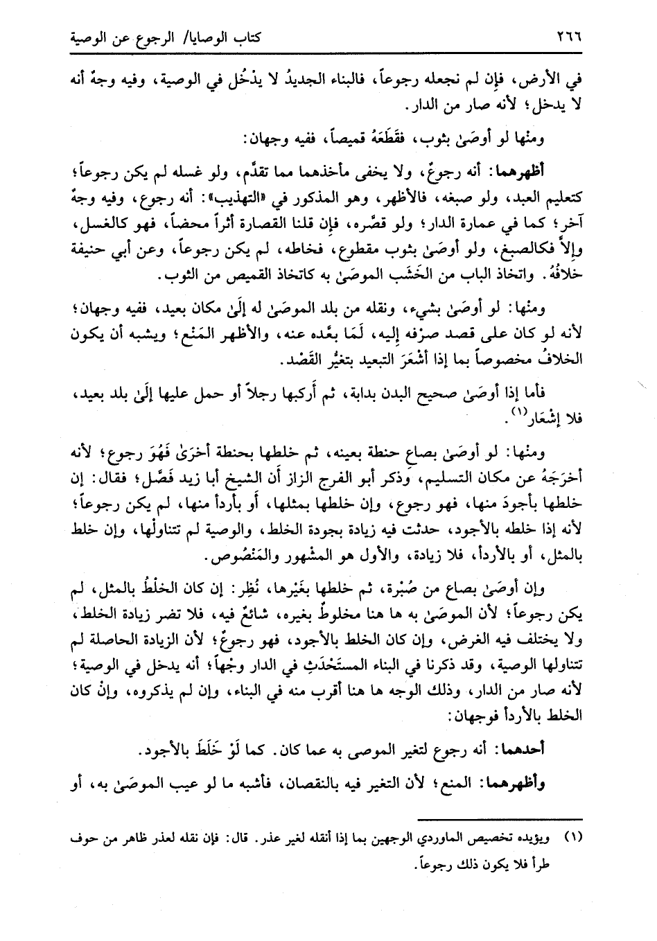 ومنْها: لو أوصَى بصاعِ حنطة بعينه، ثم خلطها بحنطة أخرَى فَهُوَ رجوع؛ لأنه أخرَجَهُ عن مكان التسليم، وذكر أبو الفرج الزاز أَن الشيخ أبا زيد فَصَّل؛ فقال: إن خلطها بأجودَ منها، فهو رجوع، وإن خلطها بمثلها، أَو بأردأ منها, لم يكن رجوعاً؛ لأنه إذا خلطه بالأجود، حدثت فيه زيادة بجودة الخلط، والوصية لم تتناولْها، وإن خلط بالمثل، أو بالأردأ، فلا زيادة، والأول هو المشْهور والمَنْصُوص.
