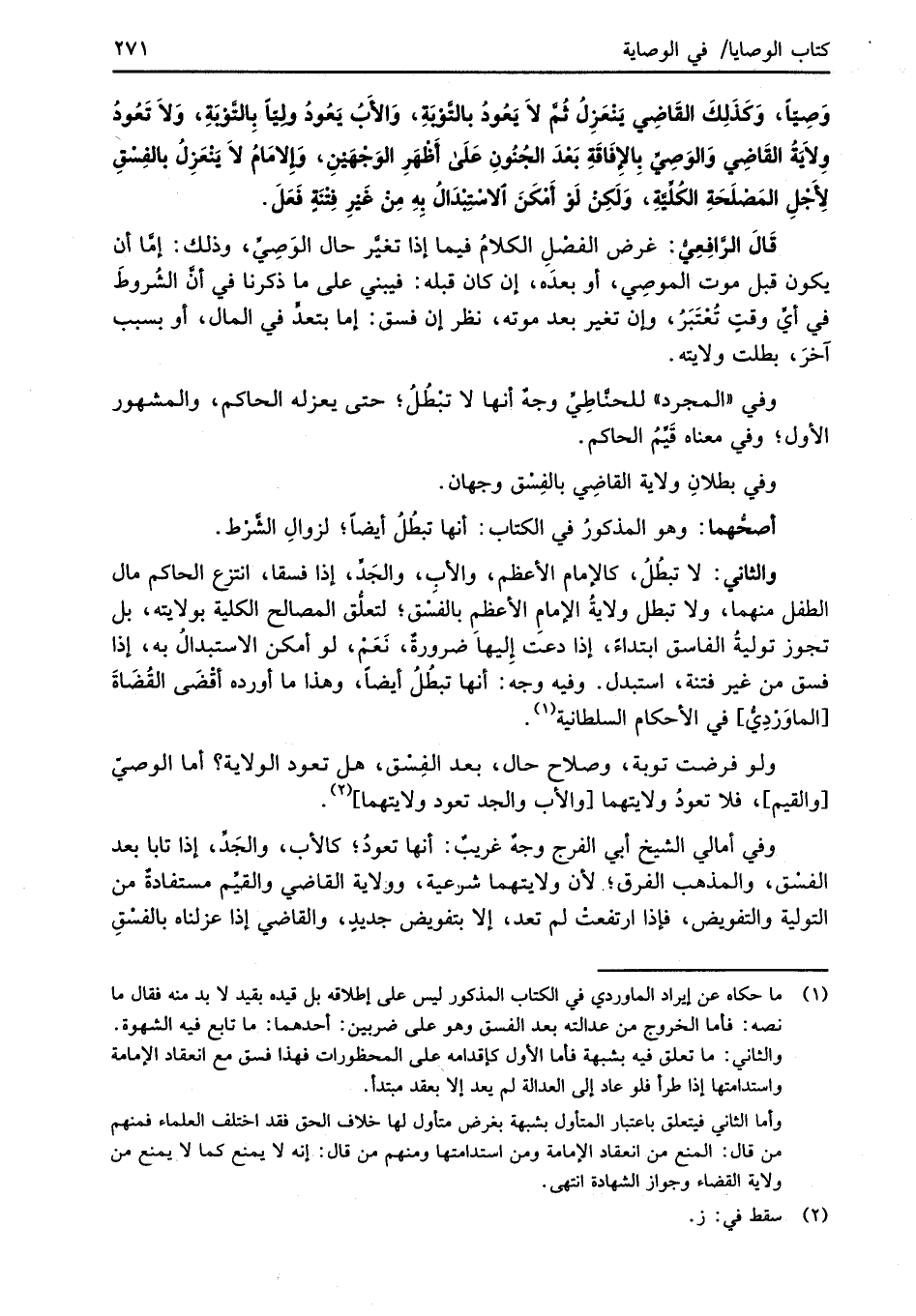 وَصِيّاً، وَكذَلِكَ القَاضِي يَنْعَزِلُ ثُمَّ لاَ يَعُودُ بالتَّوْبَةِ، وَالأَبُ يَعُودُ وليّاً بِالتَّوْبَةِ، وَلاَ تَعُودُ وِلاَيَةُ القَاضِي وَالوَصِيِّ بِالإفاقَةِ بَعْدَ الجُنُونِ عَلَى أَظْهَرِ الوَجْهَيْنِ، وَالإمَامُ لاَ ينْعَزِلُ بالفِسْقِ لِأَجْلِ المَصْلَحَةِ الكُلِّيَّةِ، وَلَكِنْ لَوْ أَمْكَنَ اَلاسْتِبْدَالُ بِهِ مِنْ غَيْرِ فِتْنَةٍ فعَلَ.
