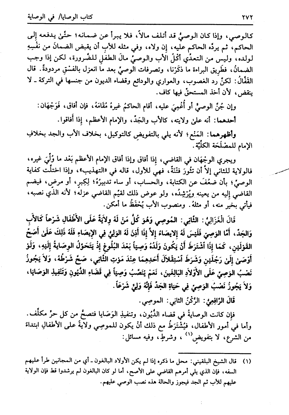 قَالَ الْغَزَالِيُّ: الثَّانِي: المُوصِي وَهُوَ كُلُّ مَنْ لَهُ وِلاَيَةٌ عَلَى الأَطفَالِ شرْعاً كَالأَبِ وَالجَدِّ، أَمَّا الوَصِيّ فَلَيْسَ لَهُ إِلايصَاءُ إِلاَّ إِذَا أَذِنَ لَهُ الوَليُّ في الإيصَاءِ فَلَهُ ذَلِكَ عَلَى أَصَحِّ القَوْلَيْنِ، كَمَا إِذَا اشتَرَطَ أَنْ يَكُونَ وَلَدُهُ وَصِيّاً بَعْدَ البُلُوغِ إِذْ يَتَحَوَّلُ الوِصَايةُ إِلَيهِ، وَلَوْ أَوْصَى إلَى رَجُلَيْنِ وَشَرَطَ اسْتِقْلاَلَ أَحَدِهِمَا عِنْدَ مَوْتِ الثَّانِي، صَحَّ شَرْطُهُ، وَلاَ يَجُوزُ نَصْبُ الوَصِيِّ عَلَى الأَولاَدِ البَالِغَينَ، نَعَمْ يُنَصَّبُ وَصِيّاً في قَضَاءِ الدُّيُونِ وَتَنفِيذِ الوَصايَا، وَلاَ يجُوزُ نَصْبُ الوَصِيِّ في حَياةِ الجَدِّ فَإنَّهُ وَليٌّ شَرْعَاً.