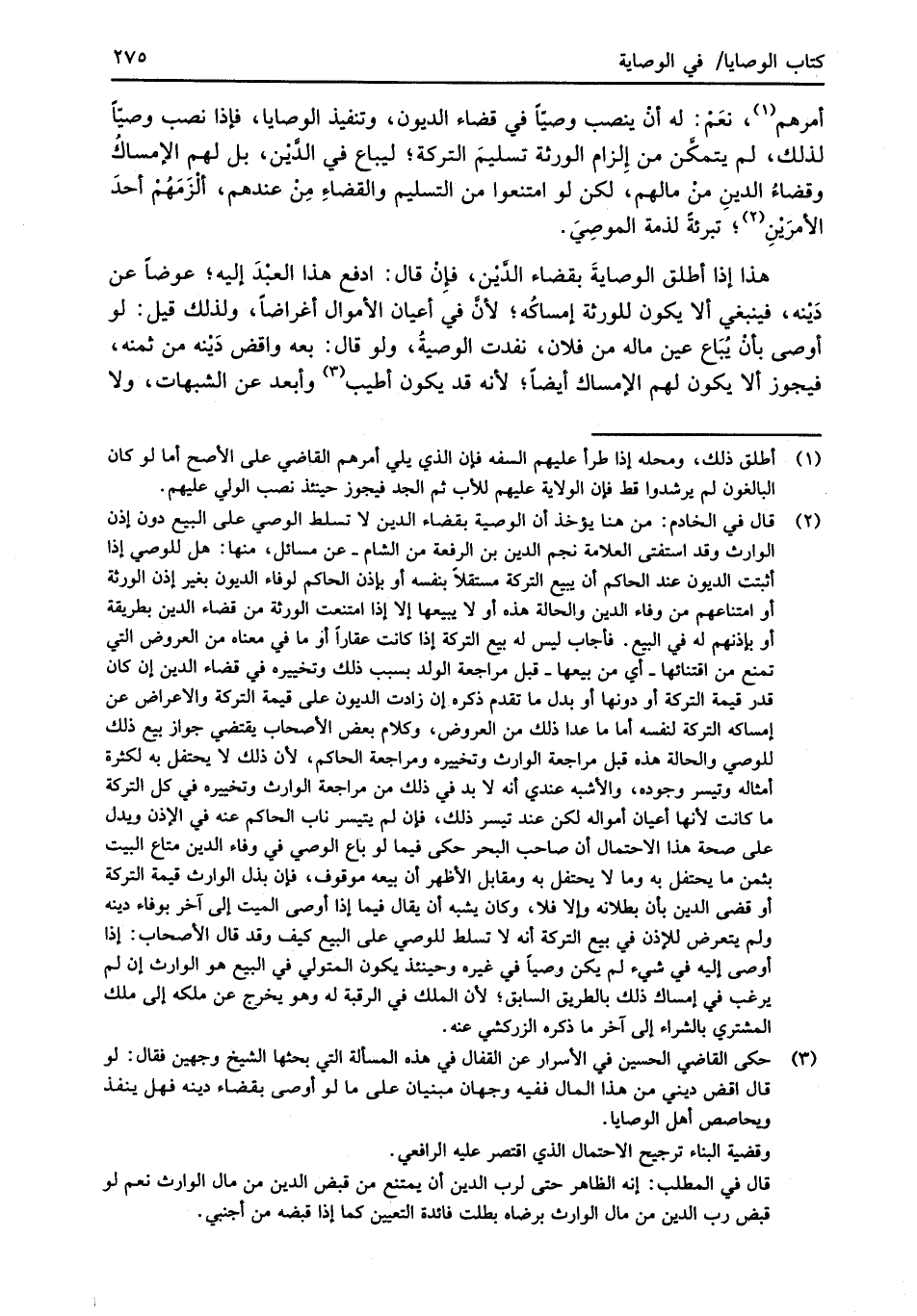 (¬2) قال في الخادم: من هنا يؤخذ أن الوصية بقضاء الدين لا تسلط الوصي على البيع دون إذن الوارث وقد استفتى العلامة نجم الدين بن الرفعة من الشام -عن مسائل، منها: هل للوصي إذا أثبتت الديون عند الحاكم أن يبيع التركة مستقلاً بنفسه أو بإذن الحاكم لوفاء الديون بغير إذن الورثة أو امتناعهم من وفاء الدين والحالة هذه أو لا يبيعها إلا إذا امتنعت الورثة من قضاء الدين بطريقة أو بإذنهم له في البيع. فأجاب ليس له بيع التركة إذا كانت عقاراً أو ما في معناه من العروض التي تمنع من اقتنائها -أي من بيعها- قبل مراجعة الولد بسبب ذلك وتخييره في قضاء الدين إن كان قدر قيمة التركة أو دونها أو بدل ما تقدم ذكره إن زادت الديون على قيمة الترجمة والاعراض عن إمساكه التركة لنفسه أما ما عدا ذلك من العروض، وكلام بعض الأصحاب يقتضي جواز بيع ذلك للوصي والحالة هذه قبل مراجعة الوارث وتخييره ومراجعة الحاكم, لأن ذلك لا يحتفل به لكثرة أمثاله وتيسر وجوده، والأشبه عندي أنه لا بد في ذلك من مراجعة الوارث وتخييره في كل التركة ما كانت لأنها أعيان أمواله لكن عند تيسر ذلك، فإن لم يتيسر ناب الحاكم عنه في الإذن ويدل على صحة هذا الاحتمال أن صاحب البحر حكى فيما لو باع الوصي في وفاء الدين متاع البيت بثمن ما يحتفل به وما لا يحتفل به ومقابل الأظهر أن بيعه موقوف، فإن بذل الوارث قيمة التركة أو قضى الدين بأن بطلانه وإلا فلا، وكان لله أن يقال في إذا أوصى الميت إلى آخر بوفاء دينه ولم يتعرض للإذن في بيع الترجمة أنه لا تسلط للوصي على البيع كيف وقد قال الأصحاب: إذا أوصى إليه في شيء لم يكن وصياً في غيره وحينئذ يكون المتولي في البيع هو الوارث إن لم يرغب في إمساك ذلك بالطريق السابق؛ لأن الملك في الرقبة له وهو يخرج عن ملكه إلى ملك المشتري بالشراء إلى آخر ما ذكره الزركشي عنه.