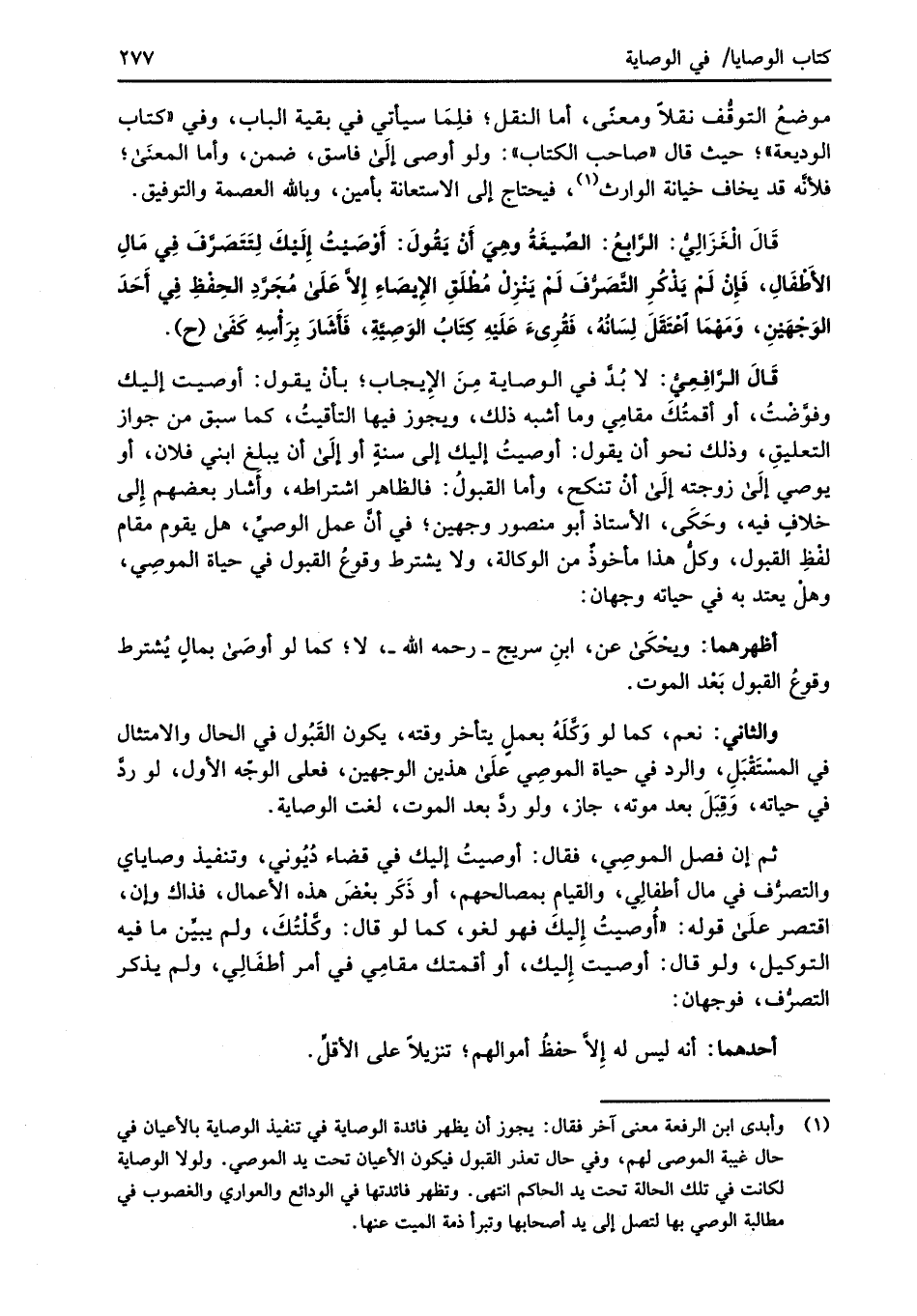 قَالَ الْغَزَالِيُّ: الرَّابعُ: الصِّيغَةُ وهِيَ أن يَقُولَ: أَوصيتُ إِلَيْكَ لِتَتَصَرَّفَ في مَالِ الأَطْفَالِ، فَإِنْ لَمْ يَذْكُرِ التَّصَرُّف لَمْ يَنْزِلْ مُطْلَقِ الإيصَاءِ إلاَّ عَلَى مُجَرَّدِ الحِفْظِ في أَحَدَ الوَجْهَيْنِ، وَمَهْمَا اعْتَقَلَ لِسَانُهُ، فَقُرِئَ عَلَيْهِ كِتَابُ الوَصِيَّةِ، فَأشَارَ بِرَأسهِ كَفَى (ح).