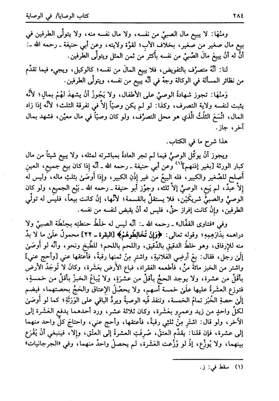 وفي "فتاوى القفَّال" -رحمه الله-: أنَّه ليس له خلْطُ حنطتِه بحِنْطَة الصبيِّ ولا دراهمه بدَارَهِمِهِ؛ وقوله تعالى: {وَإِنْ تُخَالِطُوهُمْ} [البقرة: 220]، محمولٌ عَلَى ما لا بدَّ منه للإرفاق، وهو خلطُ الدقيقِ بالدَّقيق، واللحم باللحم؛ للطَّبخِ ونحو، وأنَّه لو أَوصَى إلَى رجل، فقال: بيع أرضِي الفلانيةِ، واشترِ مِنْ ثمنها رقبةً، فأعتقها عني [وأحج عني] واشتر من الخبز مائةً منٍّ، فأطعمه الفقراءَ فباع الأَرض بعَشَرة، وكانَ لا تُوجَدُ الأرض بأقَلَّ من عشرة، ولا يوجد الحجُّ بأقلَّ من عشرَةٍ، ولا يُباعُ الخبزُ بأقلَّ من خمسةٍ، فتوزع العشَرةُ عليها عَلَى خمسة أسهمٍ، ولا يحصُلُ الإِعتاق والحَجُّ بحصتهما، فيضم إلَى حصةِ الخُبْز تمامُ الخمسة، وتنفذ فيه الوصيةُ ويردُّ الَباقي على الوَرَثَةِ؛ كما لو أَوصَى لكلِّ واحدٍ من زيد وعمرٍو بعَشَرة، وكان ثلاثة عشر، ورد أحدهما يدفع العَشَرة إلى الآخر، ولو قال: اشتَرِ مِنْ ثلثِي رقبةً، فأعتقها، وأحج عني، واحتاجَ كلُّ واحدٍ منهما إلى عشرة، فإن قلنا: يقدَّم العتقُ، صُرِفَتِ العشرةُ إلى العتْق، وإِلا، فينبغي أنْ يُقْرَع بينهمالأولا يُوزَّع، إذُ لو وُزِّعت العَشَرة، لم يحصلْ واحدٌ منهما، وفي "الجرجانيات"