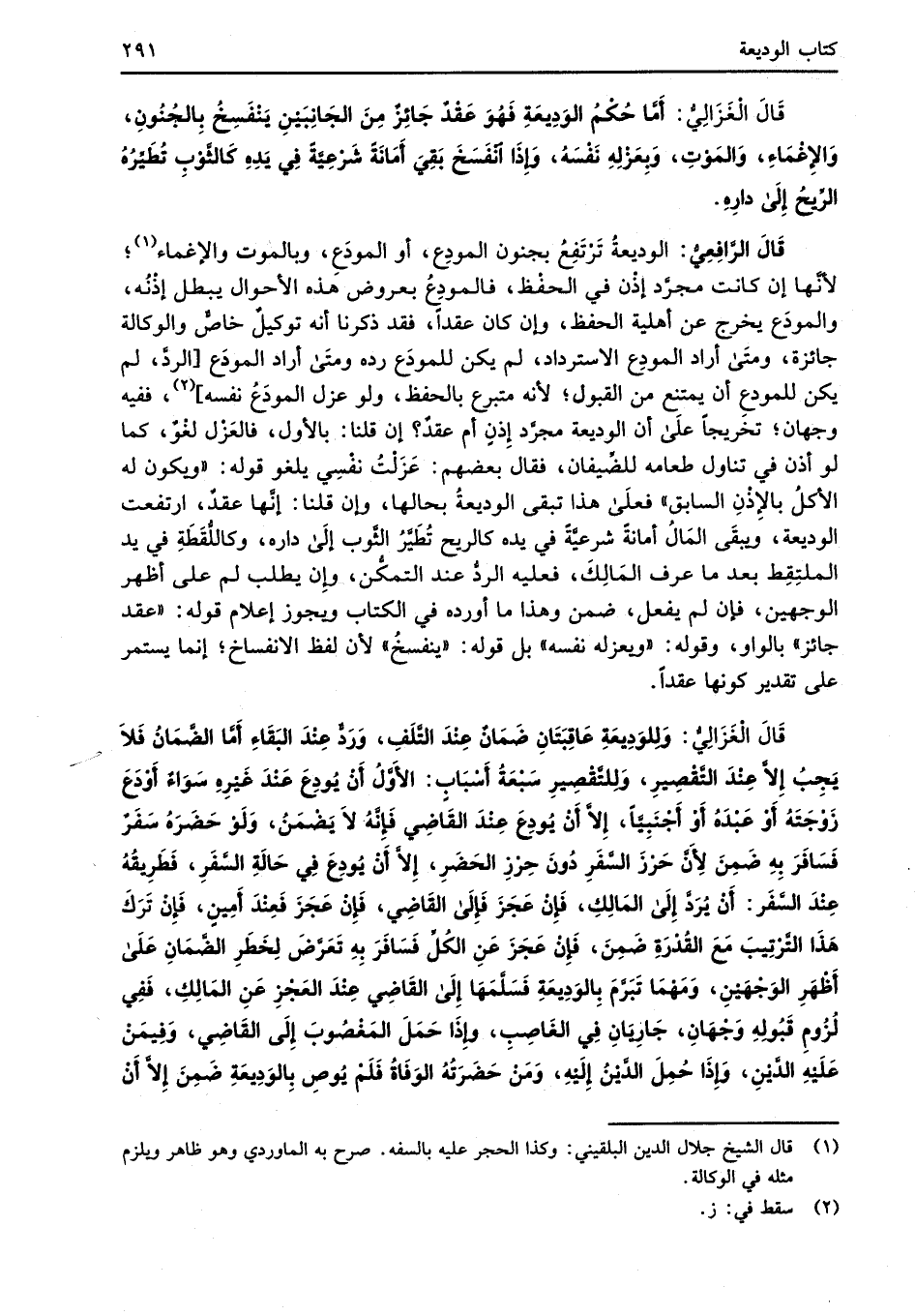 قَالَ الْغَزَالِيُّ: وَلِلوَدِيعَةِ عَاقِبَتَانِ ضَمَانٌ عِنْدَ التَّلَفِ، وَرَدٌّ عِنْدَ البَقَاءِ أَمَّا الضَّمَانُ فَلاَ يَجِبُ إِلاَّ عِنْدَ التَّقْصِيرِ، وَلِلتَّقْصِيرِ سَبْعَةُ أَسْبَابٍ: الأَوَّل أَنْ يُودِعَ عَنْدَ غيْرِهِ سَوَاءٌ أَوْدَعَ زَوْجَتَهُ أَوْ عَبْدَهُ أَوْ أَجْنَبِيَّاً، إِلاَّ أنْ يُودِعَ عِنْدَ القَاضِي فَإنَّهُ لاَ يَضْمَنُ، وَلَوْ حَضَرَهُ سَفَرٌ فَسَافَرَ بِهِ ضَمِنَ لِأَنَّ حَرْزَ السَّفَرِ دُونَ حِرْزِ الحَضَرِ، إِلاَّ أنَّ يُودِعَ في حَالَةِ السَّفَرِ، فَطَرِيقُهُ عِنْدَ السَّفَر: أنَّ يُرَدَّ إِلَى المَالِكِ، فَإنْ عَجَزَ فَإِلَى القَاضِي، فَإِنْ عَجَزَ فَعِنْدَ أَمِينٍ، فَإِنْ تَرَكَ هَذَا التَّرْتِيبَ مَعَ القُدْرَةِ ضَمِنَ، فَإِنْ عَجَزَ عَنِ الكُلِّ فَسَافَرَ بِهِ تَعَرَّضَ لِخَطَرِ الضَّمَانِ عَلَى أَظْهَرِ الوَجْهَيْنِ، وَمَهْمَا تَبَرَّمَ بِالوَدِيعَةِ فَسَلَّمَهَا إِلَى القَاضِي عِنْدَ العَجْزِ عَنِ المَالِكِ، فَفِي لُزُومِ قَبُولِهِ وَجْهَانِ، جَارِيَانِ في الغَاصِبِ، وإِذَا حَمَلَ المَغْصُوبَ إلَى القَاضِي، وَفِيمَنْ عَلَيْهِ الدَّيْنِ، وَإذَا حُمِلَ الدَّيْنُ إِلَيْهِ، وَمَنْ حَضَرَتُهُ الوَفَاةُ فَلَمْ يُوصِ بِالوَدِيعَةِ ضَمِنَ إِلاَّ أنْ
