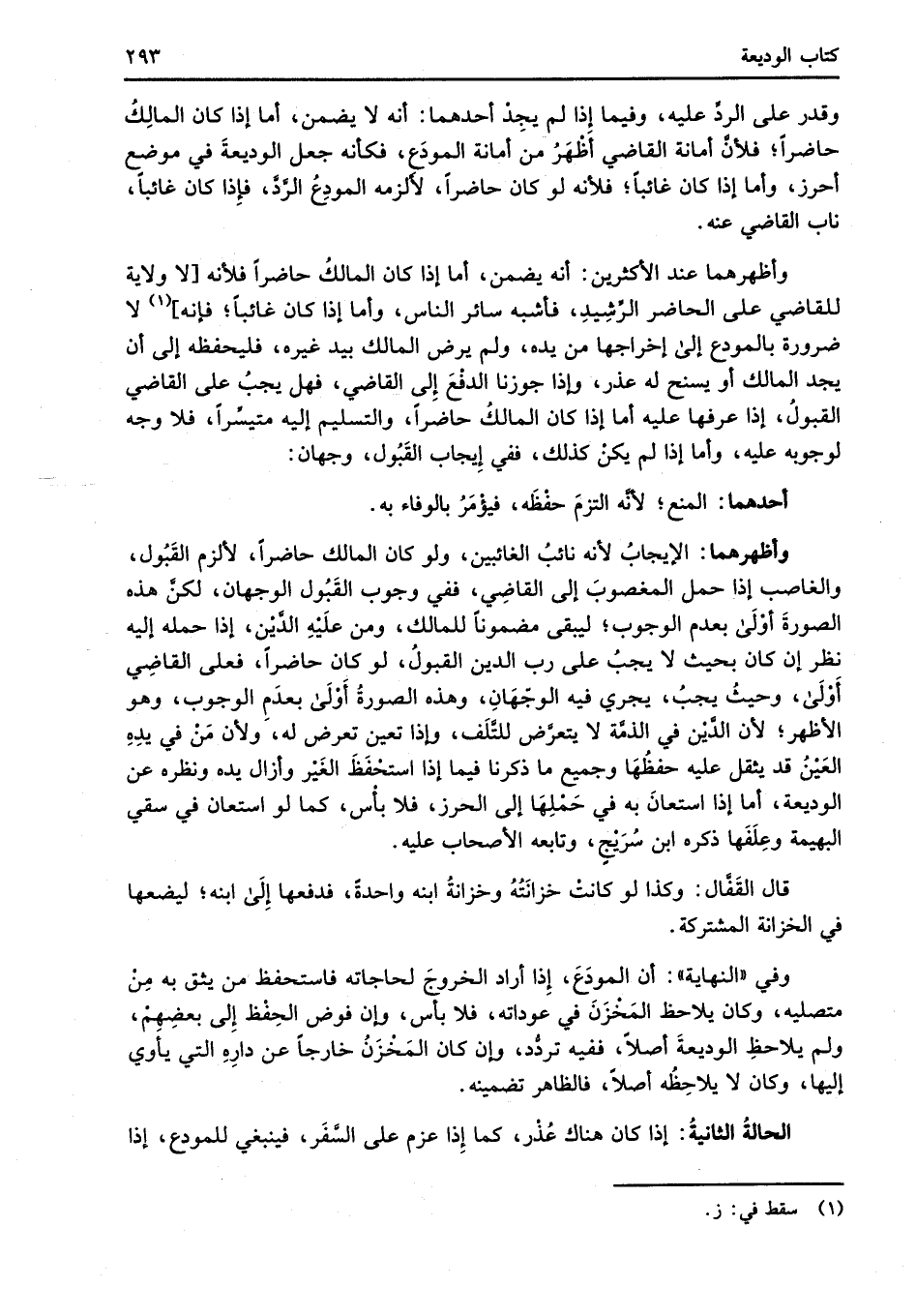وفي "النهاية": أن المودَعَ، إِذا أراد الخروجَ لحاجاته فاستحفظ من يشق به مِنْ متصليه، وكان يلاحظ المَخْزَنَ في عوداته، فلا بأس، وإن فوض الحِفْظ إِلى بعضِهِمْ، ولم يلاحظِ الوديعةَ أصلاً، ففيه تردد، وإن كان المَخْزَنُ خارجاً عن دارِهِ التي يأوي إليها، وكان لا يلاحِظُه أصلاً، فالظاهر تضمينه.