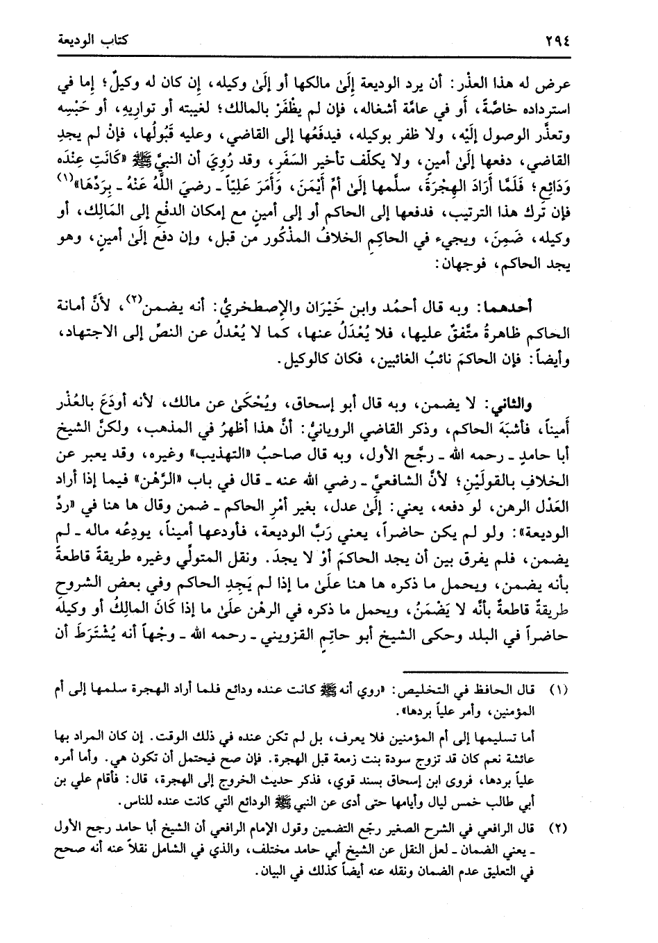 (¬2) قال الرافعي في الشرح الصغير رجّع التضمين وقول الإمام الرافعي أن الشيخ أبا حامد رجح الأول -يعني الضمان- لعل النقل عن الشيخ أبي حامد مختلف، والذي في الشامل نقلاً عنه أنه صحح في التعليق عدم الضمان ونقله عنه أيضاً كذلك في البيان.
