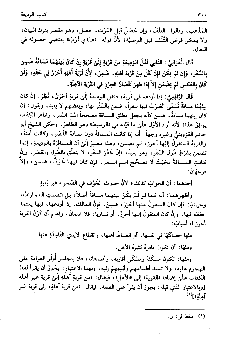 قَالَ الغَزَالِيُّ: الثَّانِي نَقْلُ الوَدِيعَةِ مِنْ قَرْيَةٍ إلَى قَرْيَةٍ إِنْ كَانَ بَيْنَهُمَا مَسَافَةٌ ضَمِنَ بِالسَّفَرِ، وَإِنْ لَمْ يكُنْ فَإِنْ نَقَلَ مِنْ قَرْيَةِ أهْلِهِ، ضَمِنَ، لِأَنَّ قَرْيَةِ أَهْلِهِ أَحْرَزَ في حَقِّهِ، وَلَوْ كَانَ بِالعَكْسِ لَمْ يَضْمَنِ إِلاَّ إِذَا ظَهَرَ نُقْصَانُ الحِرْزِ في القَرْيَةِ الآهِلَةِ.