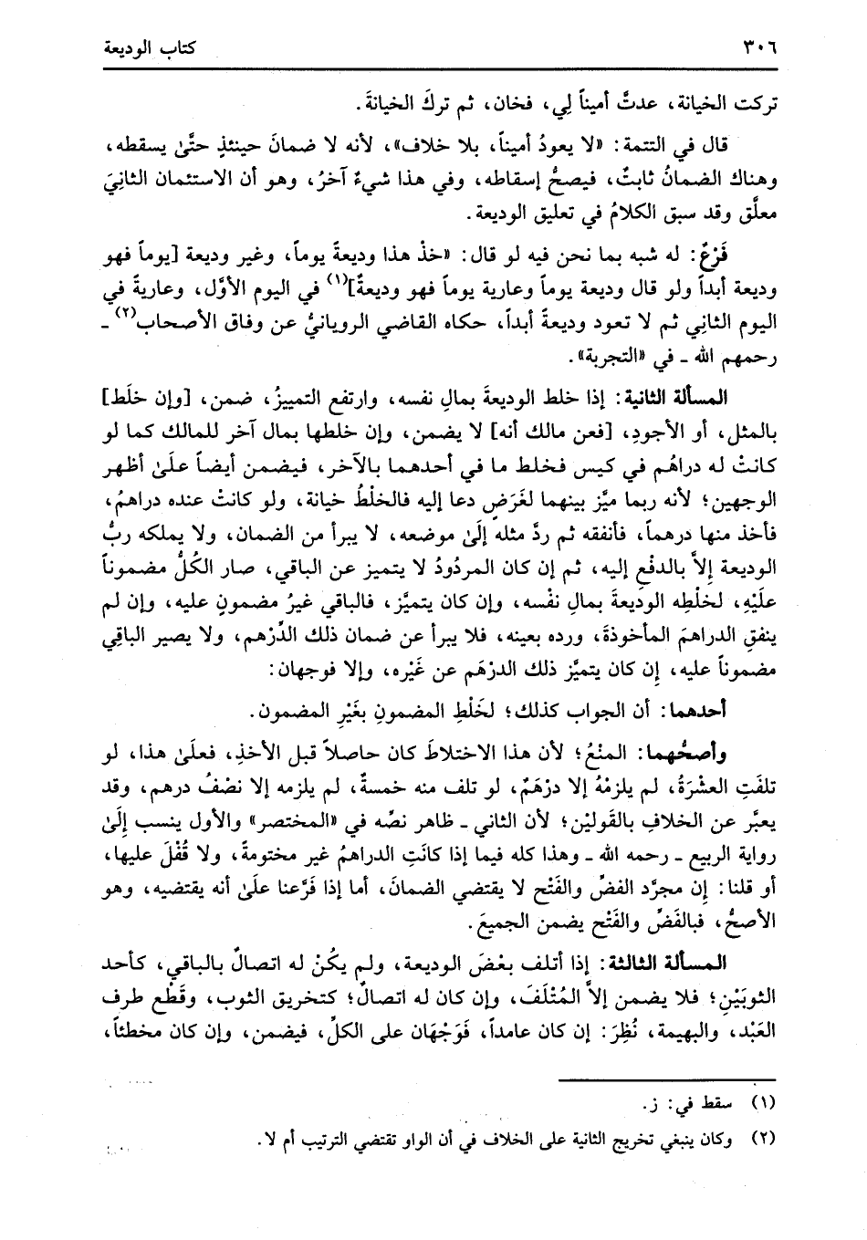 المسألة الثانية: إذا خلط الوديعةَ بمالِ نفسه، وارتفع التمييزُ، ضمن، [وإن خلَط] بالمثل، أو الأجودِ، [فعن مالك أنَّه] لا يضمن، وإن خلطها بمال آخر للمالك كما لو كانتْ له دراهُم في كيس فخلط ما في أحدهما بالآخر، فيضمن أيضاً عَلَى أظهر الوجهين؛ لأنه ربما ميَّز بينهما لغَرَضٍ دعا إليه فالخلْطُ خيانة، ولو كانتْ عنده دراهمُ، فأخذ منها درهماً، فأنفقه ثم ردَّ مثله إلَى موضعه، لا يبرأ من الضمان، ولا يملكه ربُّ الوديعة إِلاَّ بالدفْعِ إليه، ثم إن كان المردُودُ لا يتميز عن الباقي، صار الكُلُّ مضموناً علَيْهِ، لخلْطِه الودَيعةَ بمالِ نفْسه، وإن كان يتميَّز، فالباقي غيرُ مضمونٍ عليه، وإن لم ينفقِ الدراهمَ المأخوذةَ، ورده بعينه، فلا يبرأ عن ضمان ذلك الدَّرْهم، ولا يصير الباقِي مضموناً عليه، إِن كان يتميَّز ذلك الدرْهَم عن غَيْرِه، وإلا فوجهان: