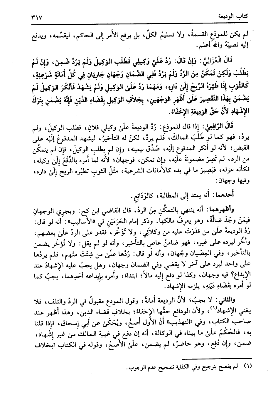 قَالَ الْغَزَالِيُّ: وَإنْ قَالَ: رُدَّ عَلَيَّ وَكِيلِي فَطَلَب الوَكِيلَ وَلَمْ يَرُدَّ ضَمِنَ، وَإِنْ لَمْ يَطْلُبْ وَلَكِنْ تَمَكَنَّ مِنَ الرَّدِّ وَلَمْ يَرُدَّ فَفِي الضَّمَانِ وَجْهَانِ جَارِيَانِ فِي كُلِّ أَمَانَةٍ شَرْعيِّةٍ، كَالثَّوْبِ إِذَا طَيَّرَهُ الرِّيحُ إِلَى دَارِهِ، وَمَهْمَا رَدَّ عَلَى الوَكِيلِ وَلَمْ يَشْهَدْ فَأنْكَرَ الوَكِيلُ لَمْ يَضْمَنْ بِهَذَا التَّقْصِيرَ عَلَى أَظْهَرِ الوَجْهَينِ، بِخِلاَفِ الوَكِيلِ بِقَضَاءِ الدَّيْنِ فإنَّهُ يُضْمَنِ بِتَرْكَ الإِشْهَادِ لأَنَّ حَقَّ الوَدِيعَةِ الإِخْفَاءُ.