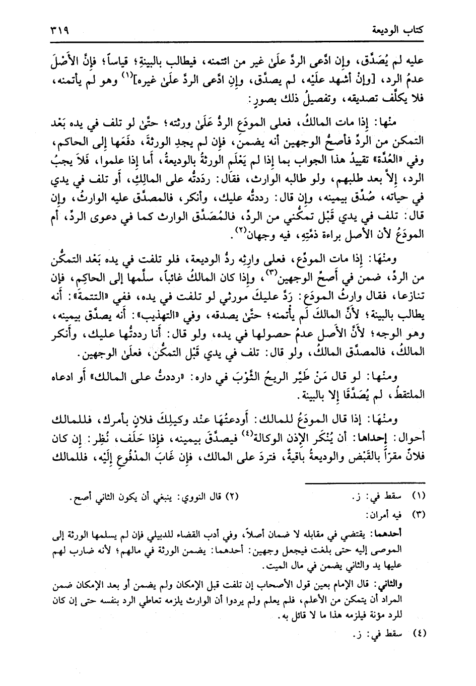 منْها: إِذا مات المالكُ، فعلى المودَعِ الردُّ عَلَى ورثته؛ حتَّى لو تلف في يده بَعْد التمكن من الردِّ فأصحُّ الوجهين أنه يضمن، فإن لم يجدِ الورثةَ، دفَعَها إِلى الحاكم، وفي "العُدَّة" تقييدُ هذا الجواب بما إِذا لم يَعْلَم الورثةُ بالوديعةُ، أَما إِذا علموا، فَلاَ يجبُ الرد، إِلاَّ بعد طلبهم، والموطألبه الوارث، فقَال: ردَدتُّه على المالِكِ، أَو تلف في يدي في حياته، صُدِّق بيمينه، وإِن قال: رددتُّه عليك، وأنكر، فالمصدَّق عليه الوارثُ، وإِن قال: تلف في يدي قَبل تمكُّني من الردِّ، فالمُصَدَّق الوارث كما في دعوى الردِّ، أم المودَعُ لأن الأصل براءة ذمَّتِهِ، فيه وجهان (¬2).