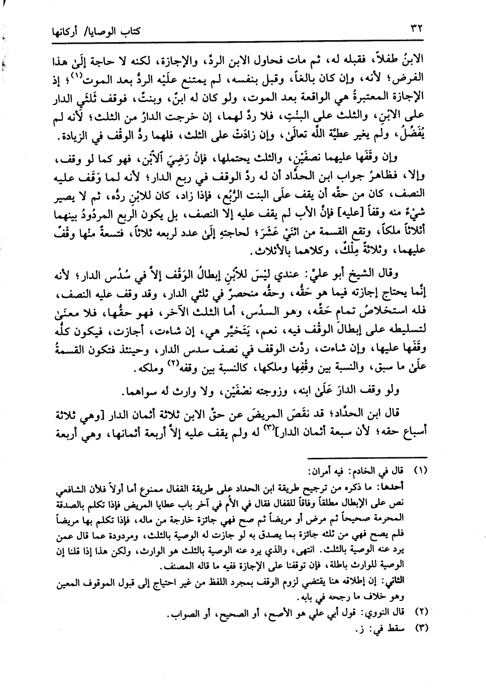 وقال الشيخ أبو عليٍّ: عندي ليْسَ للابْنِ إبطالُ الوَقْف إلاَّ في سُدُس الدار؛ لأنه إنَّما يحتاج إجازته فيما هو حَقُّه، وحقُّه منحصرٌ في ثلثي الدار، وقد وقف عليه النصف، فله استخلاصُ تمامِ حَقِّه، وهو السدُس، أما الثلث الآخر، فهو حقُّها، فلا معنَى لتسليطه على إبطالَ الوقْف فيه، نعم، يَتَخيَّر هي، إن شاءت، أجازت، فيكون كلُّه وقَفَها عليها، وإن شاءت، ردَّت الوقْف في نصف سدس الدار، وحينئذ فتكون القسمةُ عَلَى ما سبق، والنسبة بين وقْفِها وملكها، كالنسبة بين وقفه (¬2) وملكه.