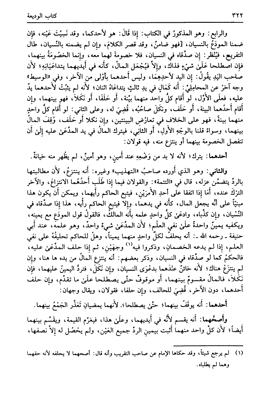 والرابع: وهو المذكورُ في الكتاب: إِذا قَالَ: هو لأحدكما، وقد نَسِيُتَ عَيْنه، فإِن ضمنا المودَعُ بالنسيان، [فهو ضامنٌ، وقد قصر الكلامَ، وإن لم يضمنه بالنِّسيان، طال التفريح، فيُنْظر: إِن صدَّقاه في النسيان، فلا خصومةَ لهما معه، وإِنما الخصُومَةُ بينهما، فإِن اصطلحا عَلَى شيْءٍ فذاك، وإلاَّ فيُجْعَل المالُ، كأَنه في أَيديهما يتداعَيَانِهِ؛ لأَن صاحب اليَدِ يقُولُ: إِن اليد لأحدِهِمَا، وليس أَحدهما بأوْلى من الآخر، وفي "الوسيط" وجه آخرُ عن المحامِلِيِّ: أَنه كَمَالٍ في يدِ ثالثٍ يتداعَاهُ اثنان؛ لأَنه لم يثبُتْ لأَحدهما يدٌ عليه، فعلَى الأَوَّل، لو أَقام كلُّ واحد منهما بيِّنة، أَو حَلَفَا، أَو نَكَلاَ، فهو بينهما، وإِن أَقام أَحدُهما البينة، أَو حَلَف، ونكَلَ صاحُبُه، قُضِيَ له، وعلى الثاني: لو أَقام كل واحدٍ منهما بينةٌ، فهو على الخلاف في تعارُضِ البينتين، وإِن نكلا أَو حَلَف، وُقِفَ المالُ بينهما، وسواءٌ قلنا بالوجّهِ الأَولِ، أَو الثانِي، فيترك المالُ في يد المدَّعَى عليه إلى أَن تنفصل الخصومة بينهما أو ينتزع منه، فيه قولان: