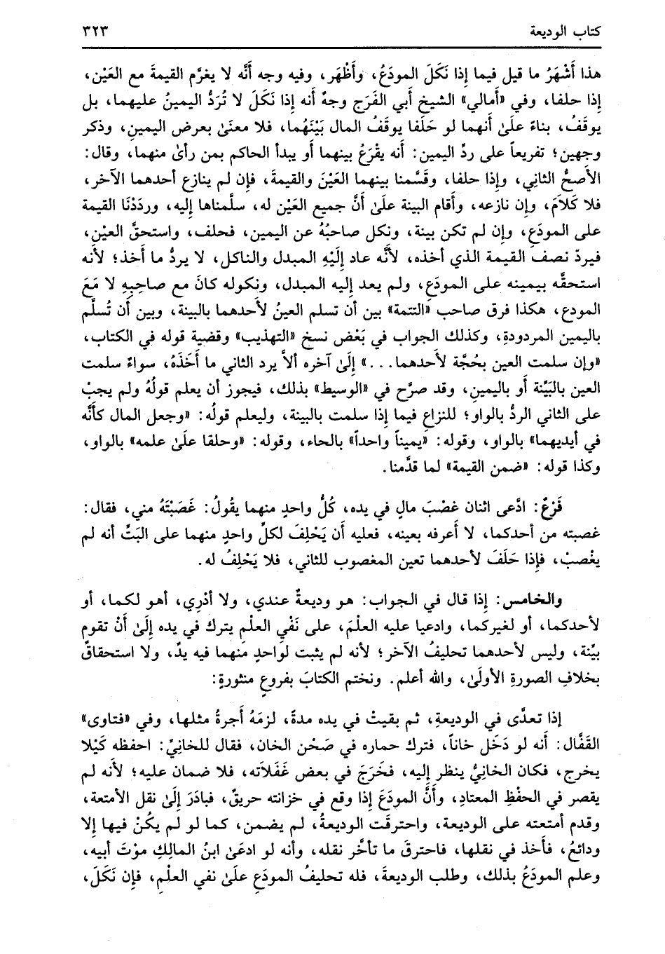 والخامس: إِذا قال في الجواب: هو وديعةٌ عندي، ولا أدْرِي، أهو لكما، أو لأحدكما، أو لغيركما، وادعيا عليه العلْمَ، على نَفْي العلْم يترك في يده إلى أَنْ تقوم بيِّنة، وليس لأحدهما تحليفُ الآخر؛ لأنه لم يثبت لوَاحدٍ مَنهما فيه يدٌ، ولا استحقاقٌ بخلافِ الصورةِ الأولَى، والله أعلم. ونختم الكتابَ بفروعٍ منثورةٍ:
