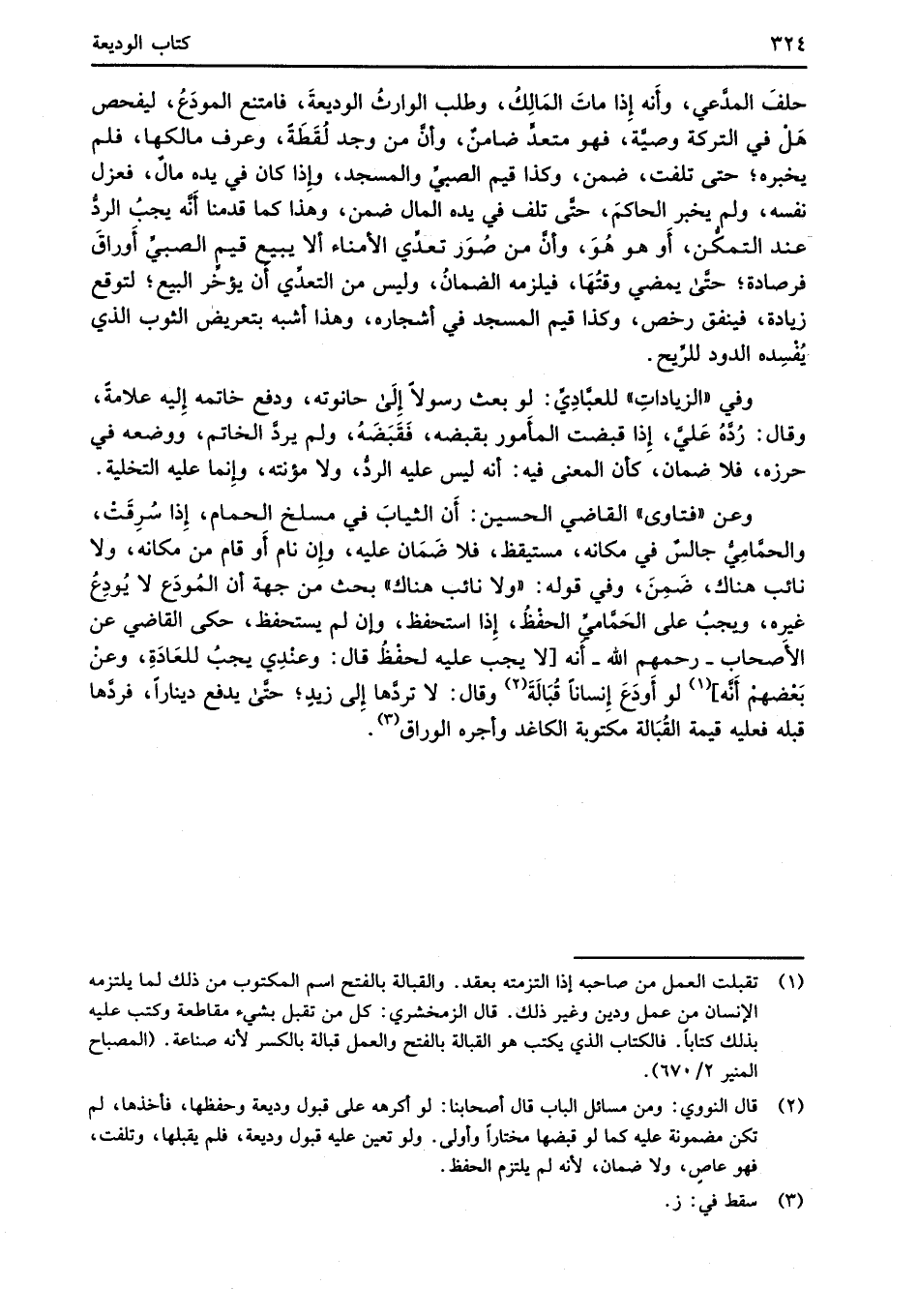 وعن "فتاوى" القاضي الحسين: أَن الثيابَ في مسلخ الحمام، إِذا سُرِقَتْ، والحمَّامِيُّ جالسٌ في مكانه، مستيقظ، فلا ضَمَان عليه، وإِن نام أَو قام من مكانه، ولا نائب هناك، ضَمِنَ، وفي قوله: "ولا نائب هناك" بحث من جهة أن المُودعَ لا يُودِعُ غيره، ويجبُ على الحمَّاميَّ الحفْظُ، إِذا استحفظ، وإن لم يستحفظ، حكى القاضي عن الأَصحاب -رحمهم الله- أنه [لا يجب عليه لحفْظُ قال: وعنْدِي يجبُ للعَادَةِ، وعنْ بعْضهمْ أَنَّه] (¬1) لو أَودَعَ إِنساناً قُبَالَةَ (¬2) وقال: لا تردَّها إِلى زيدٍ؛ حتَّى يدفع ديناراً، فردَّها قبله فعليه قيمة القُبَالة مكتوبة الكاغد وأجره الوراق (¬3).