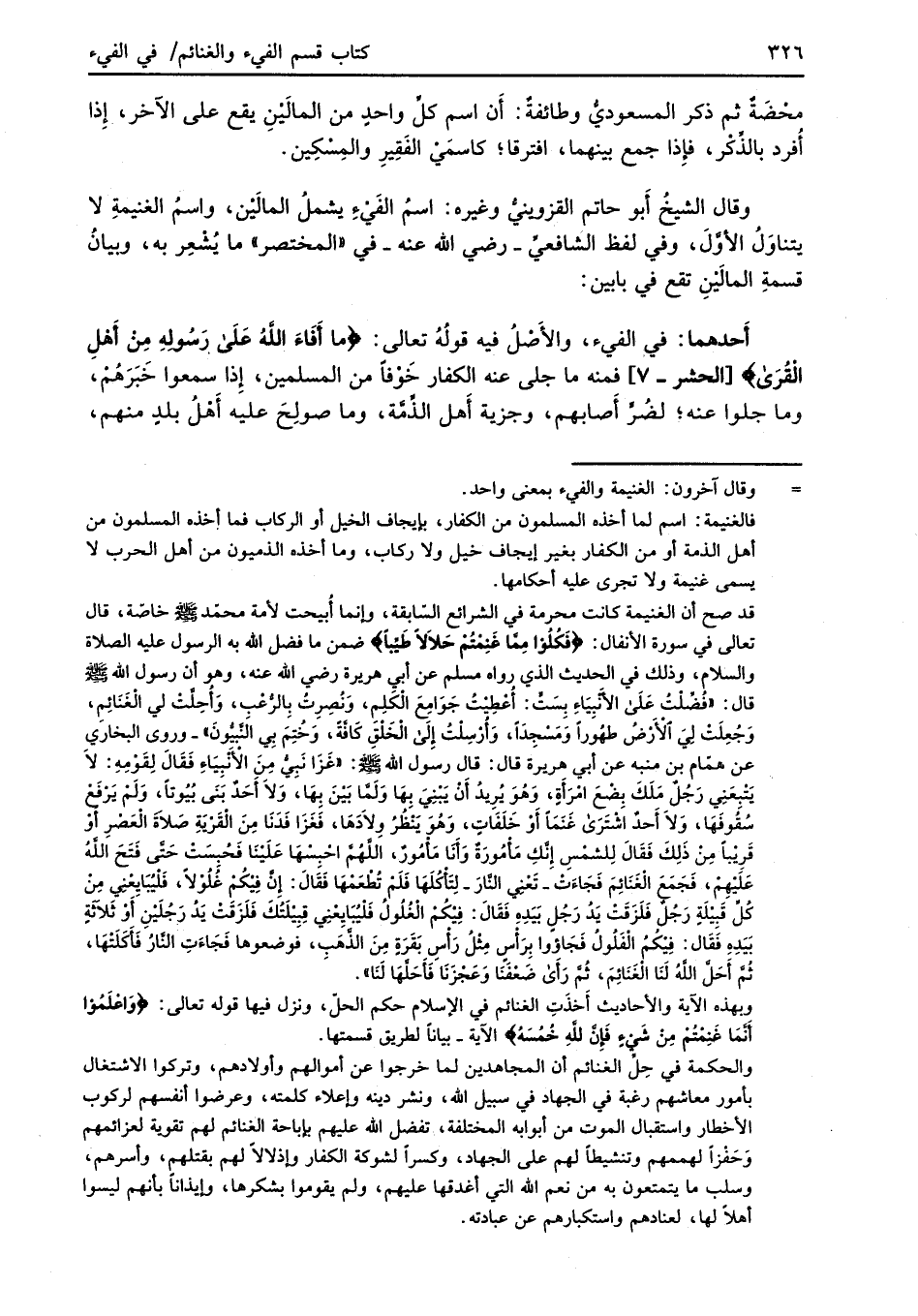 أَحدهما: في الفيء، والأَصْلُ فيه قولُهُ تعالى: {مَا أَفَاءَ الله عَلَى رَسُولِهِ مِنْ أَهْلِ الْقُرَى} [الحشر: 7] فمنه ما جلى عنه الكفار خَوْفاً من المسلمين، إِذا سمعوا خَبَرَهُمْ، وما جلوا عنه؛ لضُرٍّ أَصابهم، وجزية أَهل الذِّمَّة، وما صولِحَ عليه أَهْلُ بلدٍ منهم،