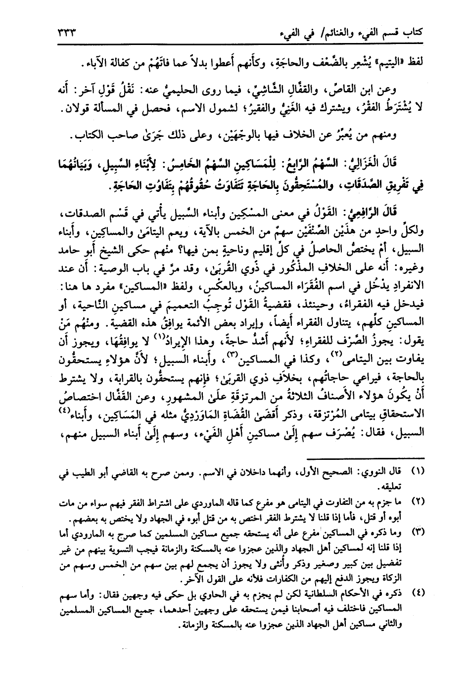 قَالَ الْغَزَالِيُّ: السَّهْمُ الرَّابعُ: لِلْمَسَاكِينِ السَّهْمُ الخَامِسُ: لِأَبْنَاءِ السَّبِيلِ، وَبَيَانُهُمَا في تَفْرِيقِ الصَّدَقَاتِ، والمُستَحِقُّونَ بِالحَاجَةِ تَتَفَاوَتُ حُقُوقُهُم بِتَفَاوُتِ الحَاجَةِ.