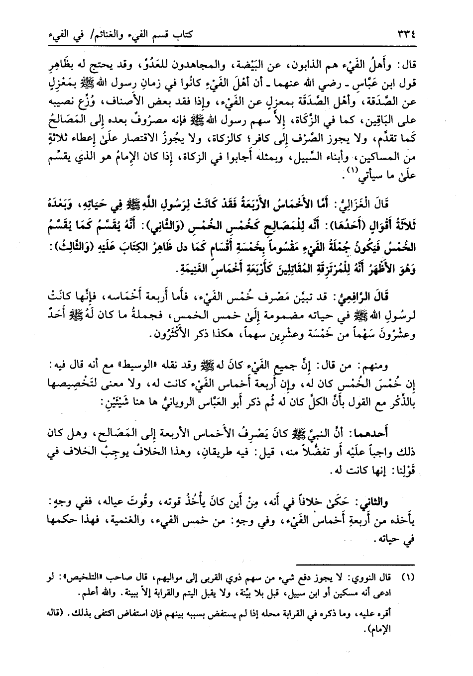 قَالَ الْغَزَالِيُّ: أَمَّا الأَخْمَاسُ الأَرْبَعَةُ فَقَدْ كَانَتْ لِرَسُولِ اللهِ -صلى الله عليه وسلم- فِي حَيَاتِهِ، وَبَعْدَهُ ثَلاَثةُ أَقْوَالٍ (أَحَدُهَا): أَنَّه لِلْمَصَالِحِ كَخُمْسِ الخُمْسِ (وَالثَّانِي): أَنَّهُ يُقَسَّمُ كَمَا يُقَسَّمُ الخُمْسُ فَيَكُونُ جُمْلَةُ الفَيْءِ مَقْسُوماً بِخَمْسَةِ أقْسَامٍ كَمَا دل ظَاهِرُ الكِتَابَ عَلَيْهِ (وَالثَّالِثُ): وَهُوَ الأَظْهَرُ أنَّهُ لِلْمُرْتَزِقَةِ المُقَاتِلِينَ كَأرْبَعَةِ أَخْمَاسِ الغَنِيمَةِ.