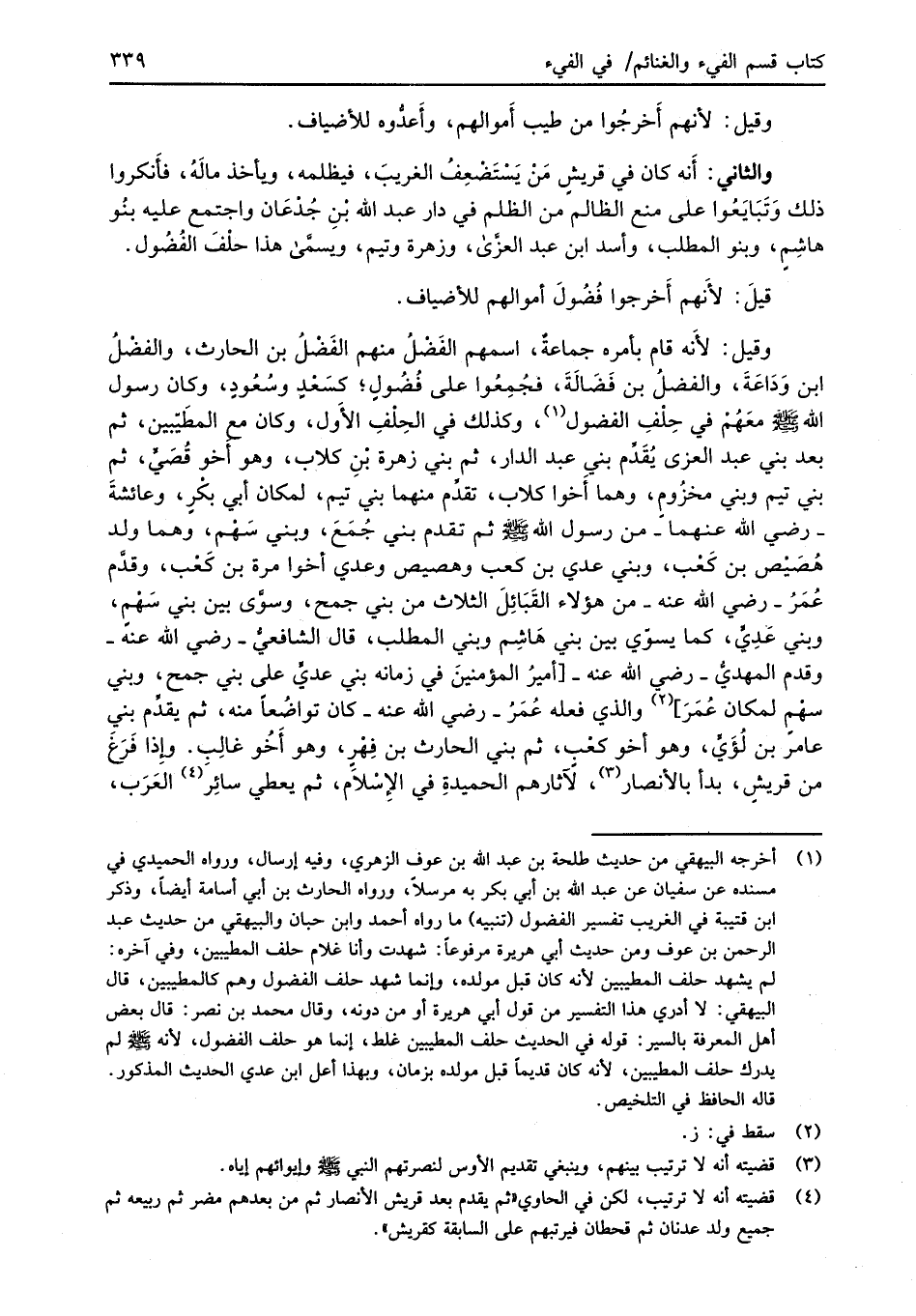 وقيل: لأَنه قام بأمره جماعةٌ، اسمهم الفَضْلُ منهم الفَضْلُ بن الحارث، والفضْلُ ابن وَدَاعَةَ، والفضلُ بن فَضَالَةَ، فجُمِعُوا على فُضُولٍ؛ كسَعْدٍ وسُعُودٍ، وكان رسول الله -صلى الله عليه وسلم- معَهُمْ في حِلْفِ الفضول (¬1)، وكذلك في الحِلْفِ الأَول، وكان مع المطَيّبين، ثم بعد بني عبد العزى يُقَدِّم بني عبد الدار، ثم بني زهرة بْنِ كلاب، وهو أخو قُصَيٍّ، ثم بني تيم وبني مخزُومٍ، وهما أَخوا كلاب، تقدِّم منهما بني تيم، لمكان أبي بكْرٍ، وعائشةَ -رضي الله عنهما- من رسول الله -صلى الله عليه وسلم- ثم تقدم بني جُمَعَ، وبني سَهْم، وهما ولد هُصَيْص بن كَعْب، وبني عدي بن كعب وهصيص وعدي أخوا مرة بن كعْب، وقدَّم عُمَرُ -رضي الله عنه- من هؤلاء القَبَائِلَ الثلاث من بني جمح، وسوَّى بين بني سَهْمٍ، وبني عَدِيًّ، كما يسوّي بين بني هَاشِم وبني المطلب، قال الشافعيُّ -رضي الله عنه- وقدم المهديُّ -رضي الله عنه-[أميرُ المؤمنينَ في زمانه بني عديٍّ علي بني جمح، وبني سهْم لمكان عُمَرَ] (¬2) والذي فعله عُمَرُ -رضي الله عنه- كان تواضُعاً منه، ثم يقدِّم بني عامر بن لُؤيٍّ، وهو أخو كعْبٍ، ثم بني الحارث بن فِهْرٍ، وهو أَخُو غالِبِ. وإِذا فَرَغَ من قريشٍ، بدأ بالأنصار (¬3)، لآثارهم الحميدةِ في الإِسْلاَم، ثم يعطي سائِرَ (¬4) العَرَب،