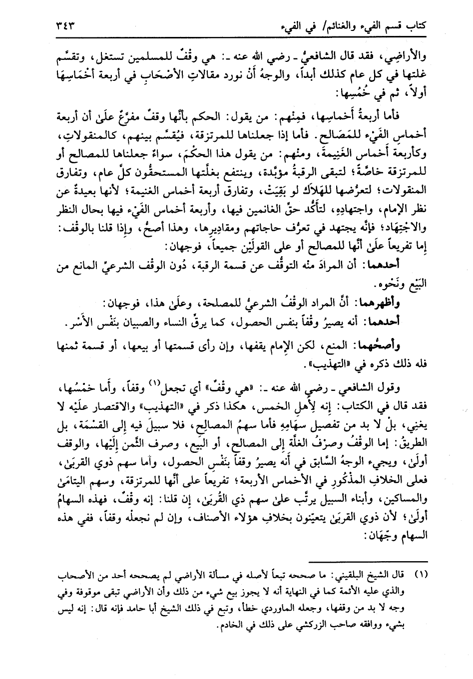 والأراضِي، فقد قال الشافعيُّ -رضي الله عنه-: هي وقْفٌ للمسلمين تستغل، وتقسَّم غلتها في كل عام كذلك أبداً، والوجهُ أَنْ نورد مقالاتِ الأصْحَاب في أربعة أخْمَاسِهَا أولاً، ثم في خُمُسِها: