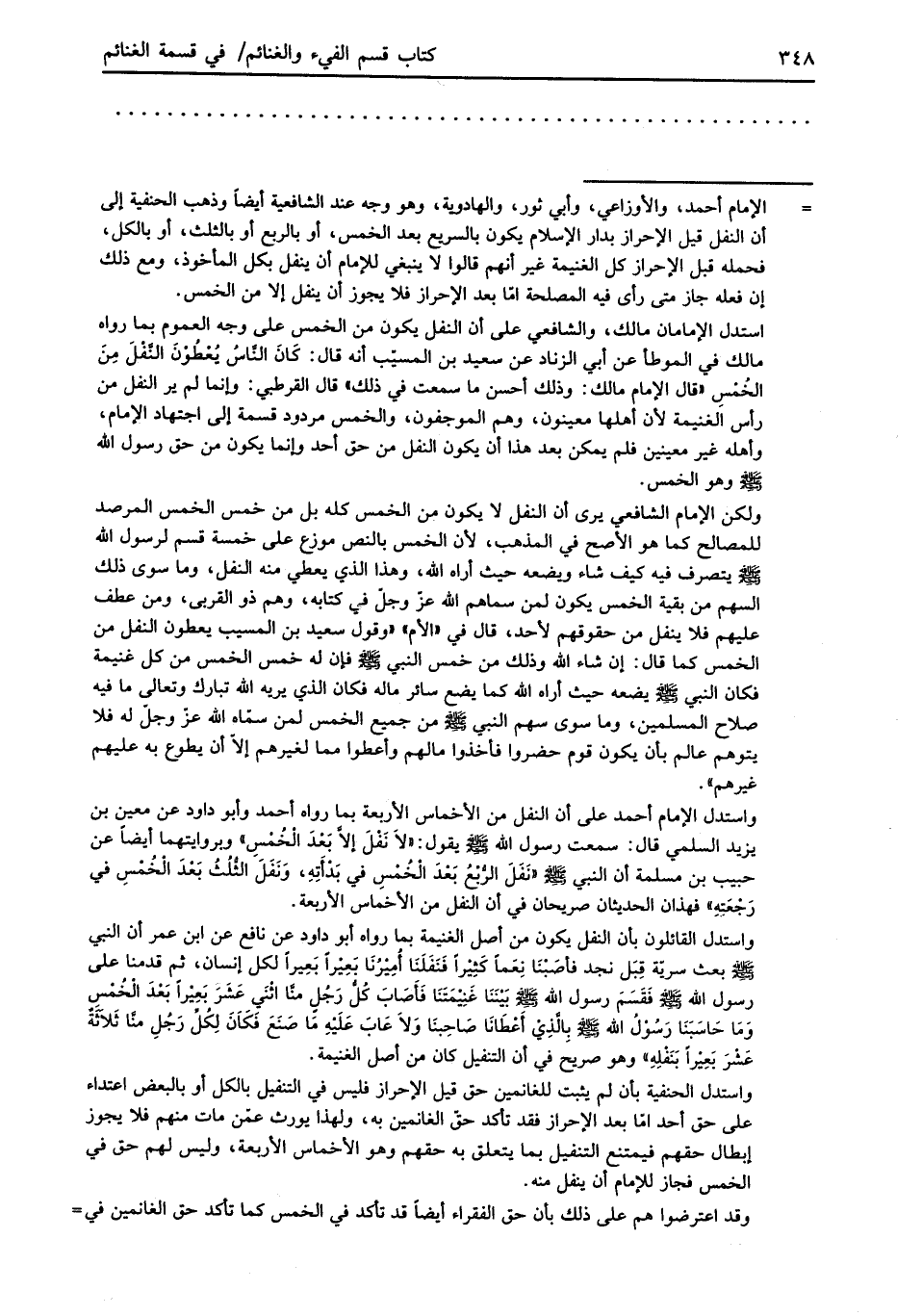 = الإمام أحمد، والأوزاعي، وأبي ثور، والهادوية، وهو وجه عند الشافعية أيضاً وذهب الحنفية إلى أن النفل قيل الإحراز بدار الإِسلام يكون بالسريع بعد الخمس، أو بالربع أو بالثلث، أو بالكل، فحمله قبل الإحراز كل الغنيمة غير أنهم قالوا لا ينبغي للإمام أن ينفل بكل المأخوذ، ومع ذلك إن فعله جاز متى رأى فيه المصلحة امّا بعد إلاحراز فلا يجوز أن ينفل إلا من الخمس.