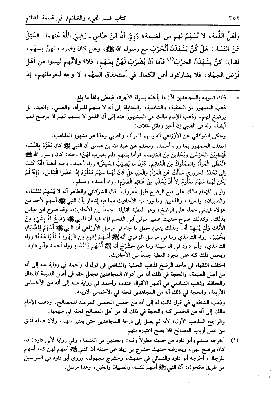 استدل الجمهور بما رواه أحمد، ومسلم عن عبد الله بن عباس أن النبي -صلى الله عليه وسلم- كان يَغْزُوْ بِالنِّسَاءِ فيَداوِيْنَ الجَرْحَى وَيُحْذين مِنَ الغنيمة، "وأما بسهم فلم يضرب لَهُنَّ" وعنه: كان رسول الله -صلى الله عليه وسلم- "نُعْطَي الْمَرأْة وَالمَمْلُوكَ مِنَ الْغَنَائِم. دُوْنَ مَا يُصِيْبُ الجَيْشُ" رواه أحمد -وعنه أيضأ "أنَّهُ كَتَبَ إلى نَجْدَةَ الحروري سَأْلْتُ عَنِ الْمَرْأةِ وَالعَبْدِ هَلْ كَانَ لَهُمَا سَهْمٌ مَعْلُوْمٌ إِذَا حَضَرا الْتِبَاسُ، وَإِنَّهُ لَمْ يَكُنْ لَهُمَا سَهْمٌ مَعْلُومٌ إِلاَّ أَن يُحْذَيَا مِنْ غَنَانِمِ الْصَوْمِ" رواه أحمد، ومسلم.
