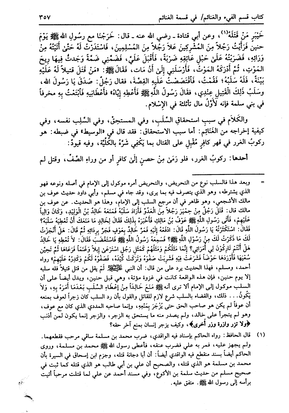 = وبعد هذا فالسلب نوع من التحريض، والتحريض أمره موكول إلى الإمام في أصله ونوعه فهو الذي يشترطه، وهو الذي يتصرف فيه بما يرى، وقد جاء في مسلم، وأبي داود حديث عوف بن مالك الأشجعي، وهو ظاهر في أن مرجع السلب إلى الإمام، وهذا هو الحديث. عن عوف بن مالك قال: قَتَلَ رَجُلٌ من حِمْيَرَ رَجُلاً مِنَ الْعَدُوِّ فَأَرَادَ سَلْبُهُ فَمَنَعَهُ خَالِدٌ بْنُ الْوَلِيْدِ، وَكَانَ وَالِياً عَلَيهِم، فَأتَى رَسُولِ اللهِ -صلى الله عليه وسلم- عَوْفُ بْنُ مَالِكِ فَأَخْبَرَهُ بِذَلِكَ فَقَالَ لِخَالِدٍ مَا مَنَعَكَ أن تُعْطِيَهُ سَلْبَهُ؟ فَقَالَ: اسْتَكثَرْتُهُ يَا رَسُولَ اللهِ قَالَ: ادْفَعْهُ إِلَيْهِ فَمَرَّ خَالِدٌ بعَوْفٍ فَجَرَّ بِرِدَائِهِ ثُمَّ قَالَ: هَلْ أَنْجَزْتُ لَكَ مَا ذَكرْتُ لَكَ مِنْ رَسُوْلِ اللهِ -صلى الله عليه وسلم-؟ فَسَمِعَهُ رَسُولُ اللهِ -صلى الله عليه وسلم- فَاسْتَغضَبَ فَقَالَ: لاَ تُعْطِهِ يَا خَالِدُ هَلْ أَنْتُم تَارِكُوْنَ لِي أُمَرَائِي؟ إِنَّمَا مَثَلُكُمْ وَمَثَلُهُم كَمَثَلِ رَجُلٍ اسْتَرْعَى إِبلاً وَغَنَمَاً فَرَعَاهَا ثُمَّ تحِيَّن سُعْيهَا فَأَوْرَدَهَا حَوْضَاً فَشَرَعَتْ فِيهِ فَشَرِبَتْ صَفْوَهُ وَتَرَكَتْ كَيْدَهُ، فَصَفْوُهُ لَكُم وَكَدِرُهُ عَلَيهِمْ" رواه أحمد، ومسلم، فهذا الحديث يرد على من قال: أن النبي عليه السلام لَمْ يقل من قتل قتيلاً فله سلبه إلا يوم حنين، فإن هذه الواقعة كانت في غزوة مؤتة، وهي قبل حنين، ويدل أيضاً على أن السلب موكول إلى الإمام ألا ترى أنه -صلى الله عليه وسلم- مَنَعَ خَالِدَاً من إعْطَاءِ السَّلَب بَعْدَمَا أَمَرَهُ بِهِ، وَلاَ يَكُونُ ... ذلك، والقضاء بالسلب شرع لازم للقاتل والقول بأن رد السلب كان زجراً لعوف بمنعه أن عوفاً لم يكن هو صاحب الحق حتى يُزْجَرَ بِمَنْعِهِ، وإنما صاحبه المددي الذي كان مع عرف، وهو لم يتجرأ على خالد، ولم يصدر منه ما يستحق به الزجر، والزجر إنما يكون لمن أذنب {وَلَا تَزِرُ وَازِرَةٌ وِزْرَ أُخْرَى}، وكيف يزجر إنسان بمنع آخر حقه؟