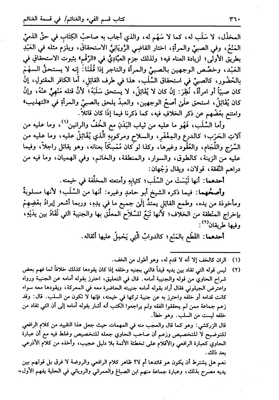 وأما السَّلَب، فَهُو ما عليه من ثياب البَدَنِ مع الخُفِّ والرانين (¬1)، وما عليه من آلاتِ الحَرْب؛ كالدرع والمِغْفَرِ، والسلاح ومركوبِهِ الَّذي يُقَاتِلُ عليه، وما عليه من السَّرْج واللِّجَام، والعُقُود وغيرها، وكذا لوَ كان مُمْسِكَاً بعنانه، وهو يقاتل راجلاً، وفيما عليه من الزينة، كالطوق، والسوار، والمنطقة، والخاتم، وفي الهميان، وما فيه من دراهم النَّفقة، قولان، ويقال وَجْهان: