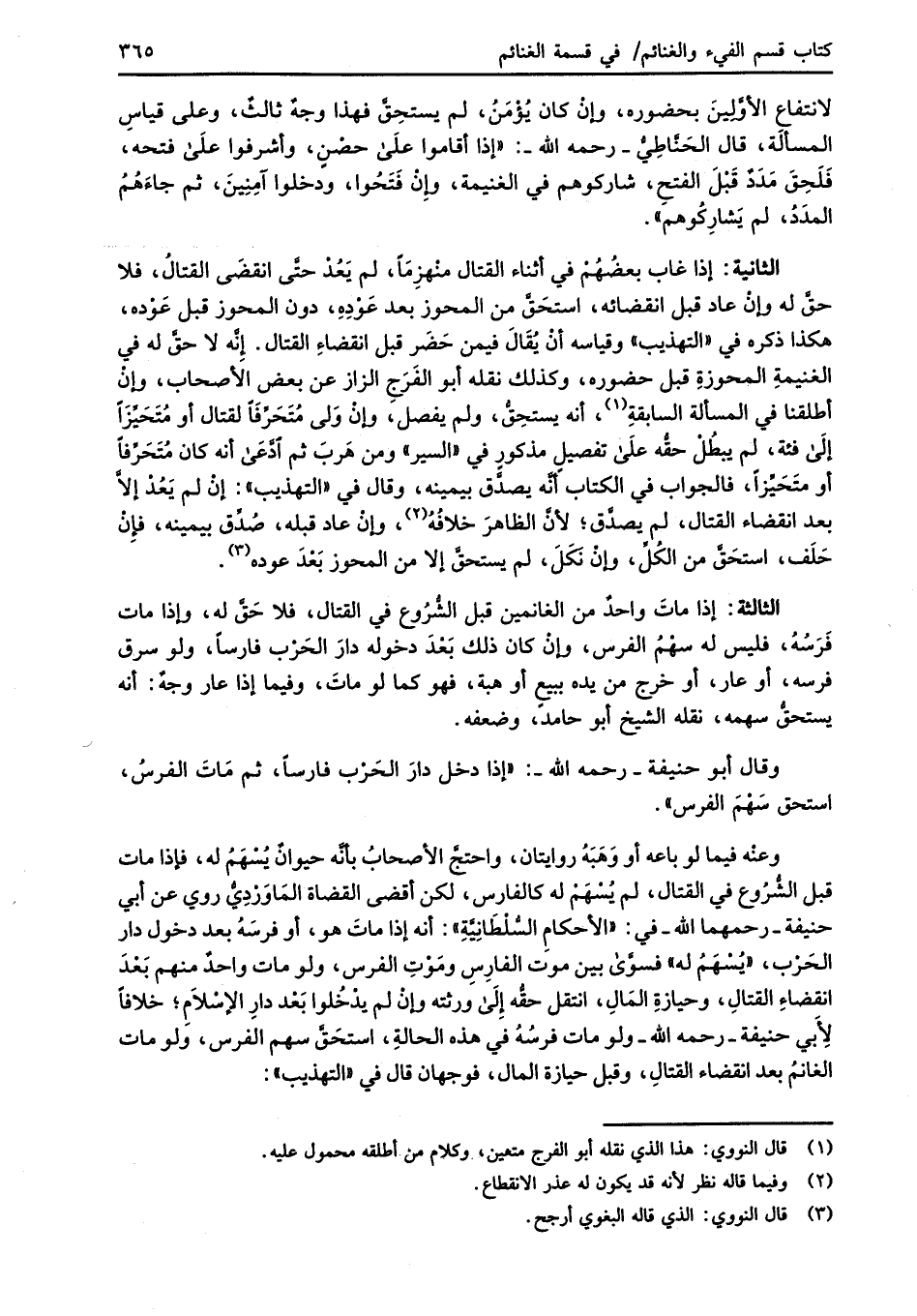 الثالثة: إذا ماتَ واحدٌ من الغانمين قبل الشُّرُوع في القتال، فلا حَقَّ له، وإذا مات فَرَسُهُ، فليس له سهْمُ الفرس، وإنْ كان ذلك بَعْدَ دخوله دارَ الحَرْب فارساً، ولو سرق فرسه، أو عار، أو خرج من يده ببيعٍ أو هبة، فهو كما لو ماتَ، وفيما إذا عار وجهٌ: أنه يستحقُّ سهمه، نقله الشيخ أبو حامد، وضعفه.