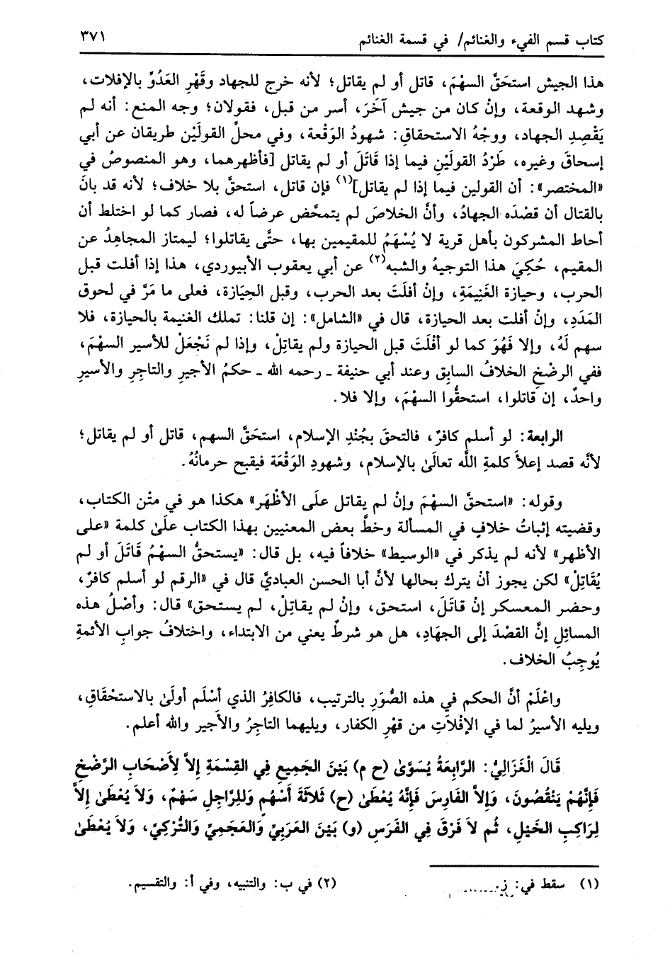 قَالَ الْغَزَالِيُّ: الرَّابِعَةُ يُسَوَّى (ح م) بَيْنَ الجَمِيعِ فِي القِسْمَةِ إلاَّ لِأَصْحَابِ الرَّضْخِ فإنَّهُمْ يَنْقُصُونَ، وَإلاَّ الفَارِسَ فَإنَّهُ يُعْطَى (ح) ثَلاَثَةَ أَسْهُمٍ وَللِرَّاجِلِ سَهْمٌ، وَلاَ يُعْطَى إلاَّ لِرَاكِبِ الخَيْلِ، ثُم لاَ فَرْقَ فِي الفَرَسِ (و) بَيْنَ العَرَبيِّ وَالعَجَمِيِّ وَالتُّركِيِّ، وَلاَ يُعْطَى