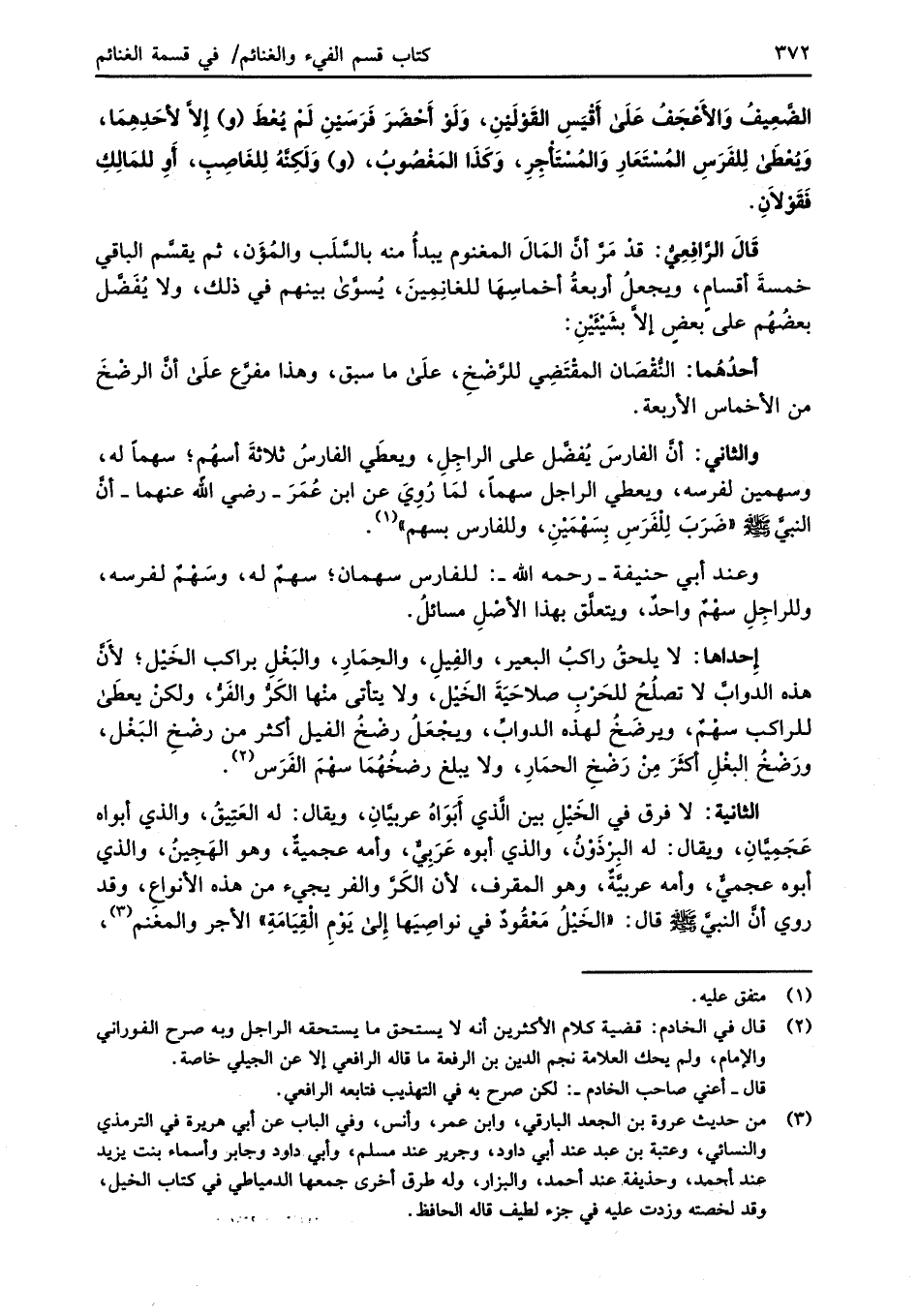 وعند أبي حنيفة -رحمه الله-: للفارس سهمان؛ سهمٌ له، وسَهْمٌ لفرسه، وللراجِلِ سهْمٌ واحدٌ، ويتعلَّق بهذا الأصْلِ مسائلُ.