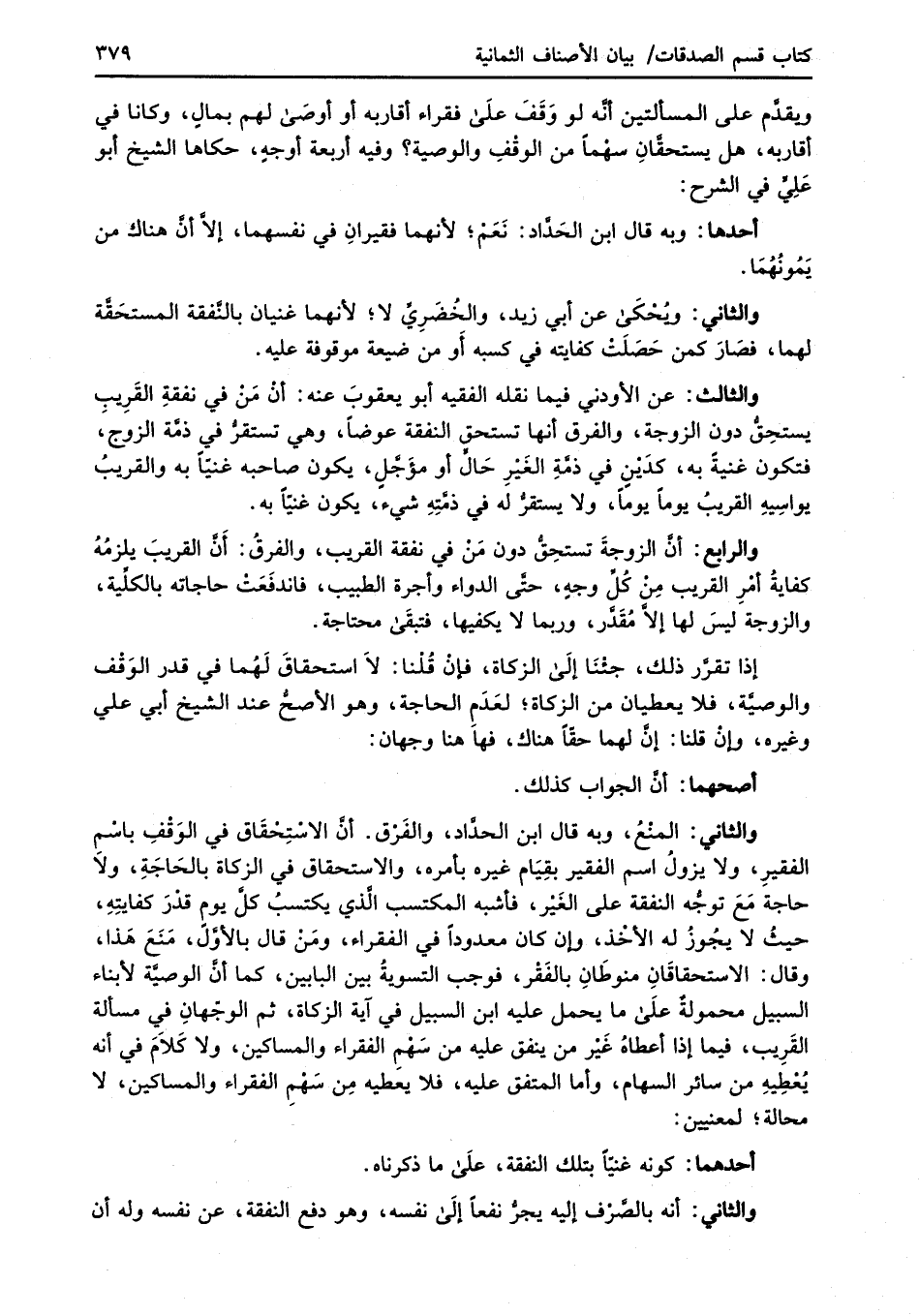 والثاني: المنْعُ، وبه قال ابن الحدَّاد، والفَرْق. أنَّ الاستِحقَاق في الوَقْفِ باسْم الفقيرِ، ولا يزولُ اسم الفقير بقِيَام غيره بأمره، والاستحقاق في الزكاة بالحَاجَةِ، ولاَ حاجة مَعَ توجُّه النفقة على الغَيْر، فأشبه المكتسب الَّذي يكتسبُ كل يومٍ قدْرَ كفايتِهِ، حيثُ لا يجوز له الأخْذ، وإن كان معدوداً في الفقراء، ومَنْ قال بالأوَّل، مَنَعَ هَذا، وقال: الاستحقاقَانِ منوطَانِ بالفَقْر، فوجب التسويةُ بين البابين، كما أنَّ الوصيَّة لأبناء السبيل محمولةٌ عَلَى ما يحمل عليه ابن السبيل في آية الزكاة، ثم الوجهانِ في مسألة القَرِيب، فيما إذا أعطاهُ غَيْر من ينفق عليه من سَهْمِ الفقراء والمساكين، ولا كَلاَمَ في أنه يُعْطِيهِ من سائر السهام، وأما المتفق عليه، فلا يعَطيه مِن سَهْمِ الفقراء والمساكين، لا محالة؛ لمعنيين: