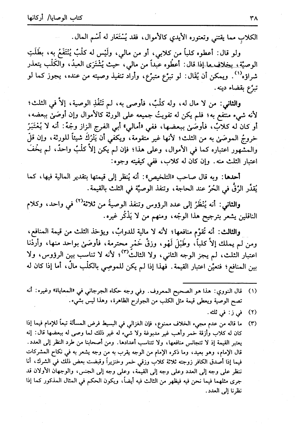 والثاني: من لا مال له، وله كلْبٌ، فأوصى به، لم تَنْفُذِ الوصية، إلاَّ في الثلث؛ لأنه شيء منتفع به؛ فلم يكن له تفويتُ جميعه على الورثة كالأموال وإن أوصَى ببعضه، أو كان له كلابٌ، فأوصى ببعضها، ففي "أمالي" أبي الفرج الزاز وجّهٌ: أنه لا يُعْتَبَرُ خروجُ الموصَى به من الثلث؛ لأنها غير متقومة، ويكفي أن يَتْرُكَ شيئاً للورثة، وإن قلّ والمشهور اعتباره كما في الأموال، وعلى هذا؛ فإن لم يكن إلاَّ كلْبٌ واحدٌ، لم يخْفَ اعتبار الثلث منه. وإن كان له كلاب، ففي كيفيته وجوه: