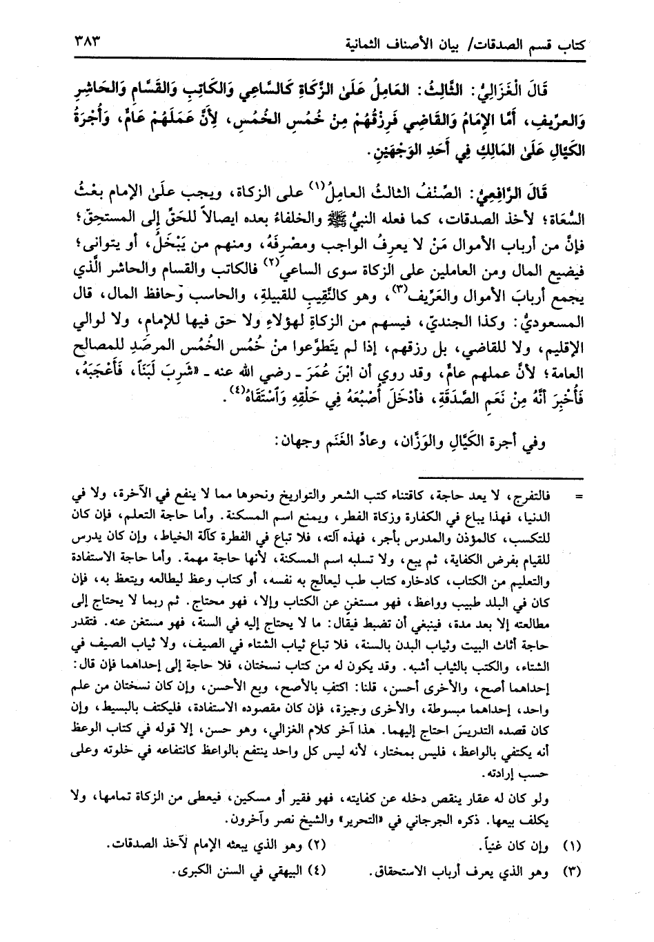 قَالَ الْغَزَالِيُّ: الثَّالِثُ: العَامِلُ عَلَى الزَّكَاةِ كَالسَّاعِي وَالكَاتِبِ والقَسَّامِ وَالحَاشِرِ وَالعرِّيفِ، أَمَّا الإمَامُ وَالقَاضِي فَرِزقُهُم مِنْ خُمُسِ الخُمُسِ، لأَنَّ عَمَلَهُم عَامٌّ، وَأُجْرَةُ الكَيَّالِ عَلَى المَالِكِ فِي أَحَدِ الوَجْهَيْنِ.