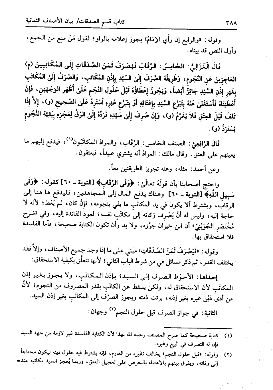 قَالَ الْغَزَالِيُّ: الخَامِسُ: الرِّقَابُ فَيُصْرَفُ ثَمَنُ الصَّدَقَاتِ إِلَى المُكَاتِبِينَ (م) العَاجِزِينَ عَنِ النُّجُومِ، وَطَرِيقُهُ الصَّرْفُ إِلَى السَّيِّدِ بِإذْنِ المُكَاتَبِ، وَالصَّرْفُ إلى المُكَاتَبِ بِغَيْرِ إِذْنِ السَّيِّدِ جَائِزٌ أَيْضاً، وَيجُوزُ إِعْطَاؤُهُ قَبْلَ حُلُولِ النَّجْمِ عَلَى أَظْهَر الوَجْهَيْنِ، فَإِنْ أَعْطَينَاهُ فَاسْتَغنَى عَنْهُ بِتَبَرُّعِ السَّيِّدِ بِإِعْتَاقِهِ أَوْ بِتَبَرُّعِ غَيْرِهِ اسْتُرِدَّ عَلَى الصَّحِيحِ (و)، إِلاَّ إِذَا تَلِفَ قَبلَ العِتْقِ فَلاَ يُغَرَّمُ (و)، وَإِنْ صُرِفَ إِلَى سَيَّدِهِ فَرَدَّهُ إلى الرِّقِّ لِعَجْزِهِ بِبَقِيَّةِ النُّجُومِ يُسْتَرَدُّ (و).