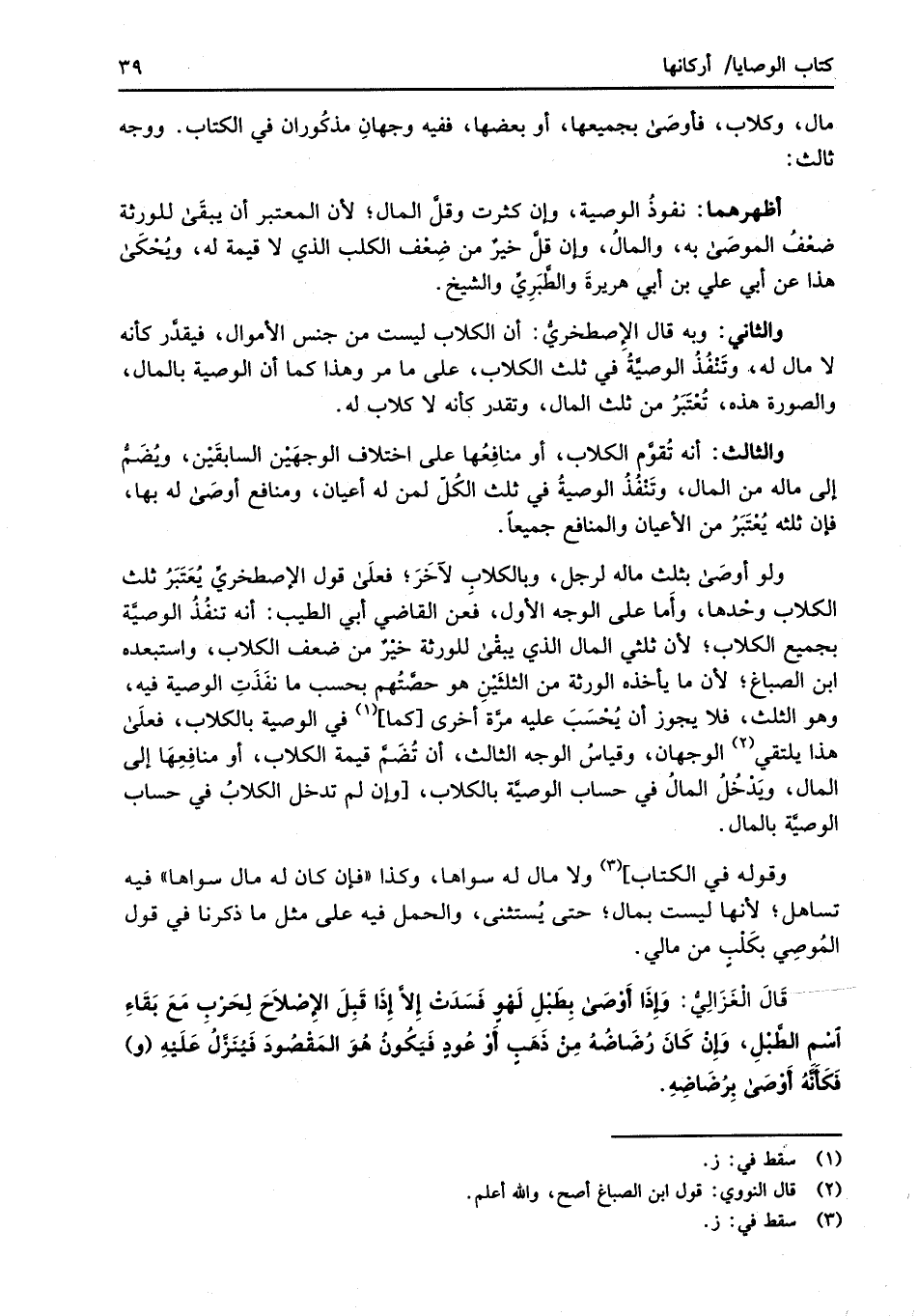 والثاني: وبه قال الإِصطخريُّ: أن الكلاب ليست من جنس الأموال، فيقدَّر كأنه لا مال له، وتَنْفُذُ الوصيَّةُ في ثلث الكلاب، على ما مر وهذا كما أن الوصية بالمال، والصورة هذه، تُعْتَبَرُ من ثلث المال، وتقدر كأنه لا كلاب له.