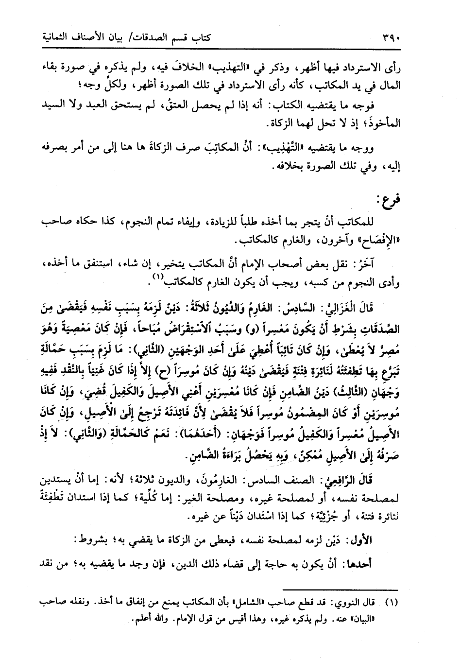 قَالَ الْغَزَالِيُّ: السَّادِس: الغَارِمُ وَالدَّيُونُ ثَلاَثةُ: دَيْنٌ لَزِمَهُ بِسَبَبِ نَفْسِهِ فَيَقْضَى مِنَ الصَّدَقَاتِ بِشَرْطِ أن يَكُونَ مَعْسِراً (و) وسَبَبُ الاَسْتِقْرَاضُ مُبَاحاً، فَإِنْ كَانَ مَعْصِيَةَ وَهُوَ مُصِرُّ لاَ يُعْطَى، وَإِنْ كَانَ تَائِبَاً أُعْطِيَ عَلَى أَحَدِ الوَجْهَيْنِ (الثَّانِي): مَا لَزِمَ بِسَبَبِ حَمَّالَةِ تَبَرُّعِ بِهَا تَطِفئَتهُ لَنَائِرَةِ فِتْنَة فَيُقْضَى دَيْنُهُ وَإِنْ كَانَ مُوسِرَاً (ح) إِلاَّ إِذَا كَانَ غَنِيّاً بِالنَّقْدِ فَفِيهِ وَجْهَانِ (الثَّالِثُ) دَيْنُ الضَّامِنِ فَإِنْ كَانَا مُعْسِرَينِ أَعْنِي الأَصِيلَ وَالكَفِيلَ قُضِيَ، وَإِنْ كَانَا موسِرَينِ أَوْ كَانَ المِضْمُونُ مُوسِراً فلاَ يُقْضَى لأَنَّ فَائِدَتَهُ تَرْجِعُ إلى الأَصِيلِ، وَإِنْ كَانَ الأَصِيلُ مُعْسِراً وَالكَفِيلُ موسِراً فَوَجْهَانِ: (أَحَدَهُمَا): نَعَمْ كَالحَمَّالَةِ (وَالثَّانِي): لاَ إِذْ صَرْفُهُ إلى الأَصِيلِ مُمْكِنٌ، وَبِهِ يَحْصُلُ بَرَاءَةُ الضَّامِنِ.
