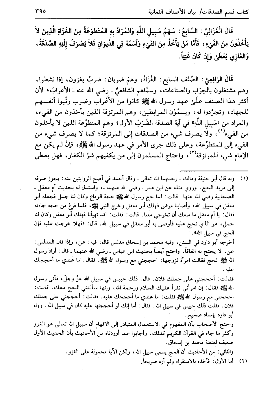 (¬1) وبه قال أبو حنيفة ومالك -رحمهما الله تعالى- وقال أحمد في أصح الروايتين عنه: يجوز صرفه إلى مريد الحج. وروي مثله عن ابن عمر -رضي الله عنهما-، واستدل له بحديث أم معقل -الصحابية رضي الله عنها- قالت: لما حج رسول الله -صلى الله عليه وسلم- حجة الوداع وكان لنا جمل فجعله أبو معقل في سبيل الله، وأصابنا مرض فهلك أبو معقل وخرج النبي -صلى الله عليه وسلم-، فلما فرغ من حجه جاءته فقال: يا أم معقل ما منعك أن تخرجي معنا. قالت: فقلت: لقد تهيأنا فهلك أبو معقل وكان لنا جمل، هو الذي نحج عليه فأوصى به أبو معقل في سبيل الله. قال: "فهلا خرجت عليه فإن الحج في سبيل الله".