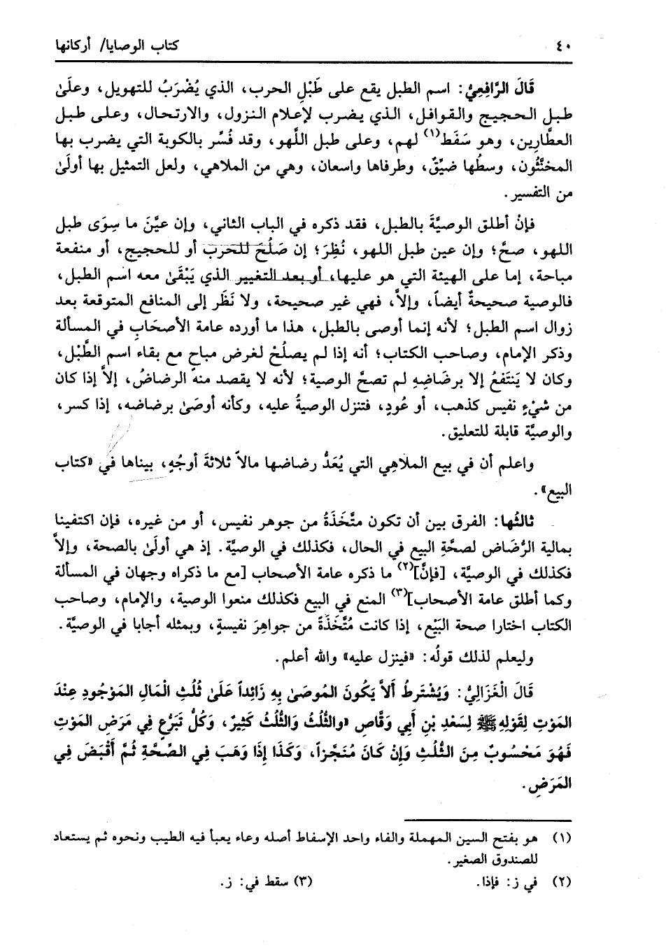 فإنْ أطلق الوصيَّةَ بالطبل، فقد ذكره في الباب الثاني، وإن عيَّنَ ما سِوَى طبل اللهو، صحَّ؛ وإن عين طبل اللهو، نُظِرَ؛ إن صَلُحَ للحرب أو للحجيج، أو منفعة مباحة، إما على الهيئة التي هو عليها, أو بعد التغيير الذي يَبْقَى معه اسم الطبل، فالوصية صحيحةٌ أيضاً، وإلاَّ، فهي غير صحيحة، ولا نَظَر إلى المنافع المتوقعة بعد زوال اسم الطبل؛ لأنه إنما أوصى بالطبل، هذا ما أورده عامة الأصحَابِ في المسألة وذكر الإمام، وصاحب الكتاب؛ أنه إذا لم يصلُحُ لغرض مباحٍ مع بقاء اسم الطَّبْل، وكان لا يَنتَفعُ إلا برضَاضِهِ لم تصحَّ الوصية؛ لأنَّه لا يقصد منه الرضاضُ، إلاَّ إذا كان من شيْءٍ نفيس كذهب، أو عُودٍ، فتنزل الوصيةُ عليه، وكأنه أوصَى برضاضه، إذا كسر، والوصيَّة قابلة للتعليق.