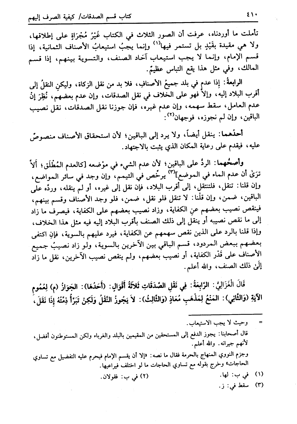 قَالَ الْغَزَالِيُّ: الرَّابِعَةُ: في نَقْلِ الصَّدَقَاتِ ثَلاَثةُ أَقْوَالٍ: (أَحَدُهَا): الجَوَازُ (م) لِعُمُومِ الآيَةِ (وَالثَّانِي): المَنْعُ لِمَذْهَبِ مُعَاذٍ (وَالثَّالِثُ): لاَ يَجُوزُ النَّقْلُ وَلَكِنْ تَبَرَّأُ ذِمَّتُهُ إِذَا نَقَلَ،