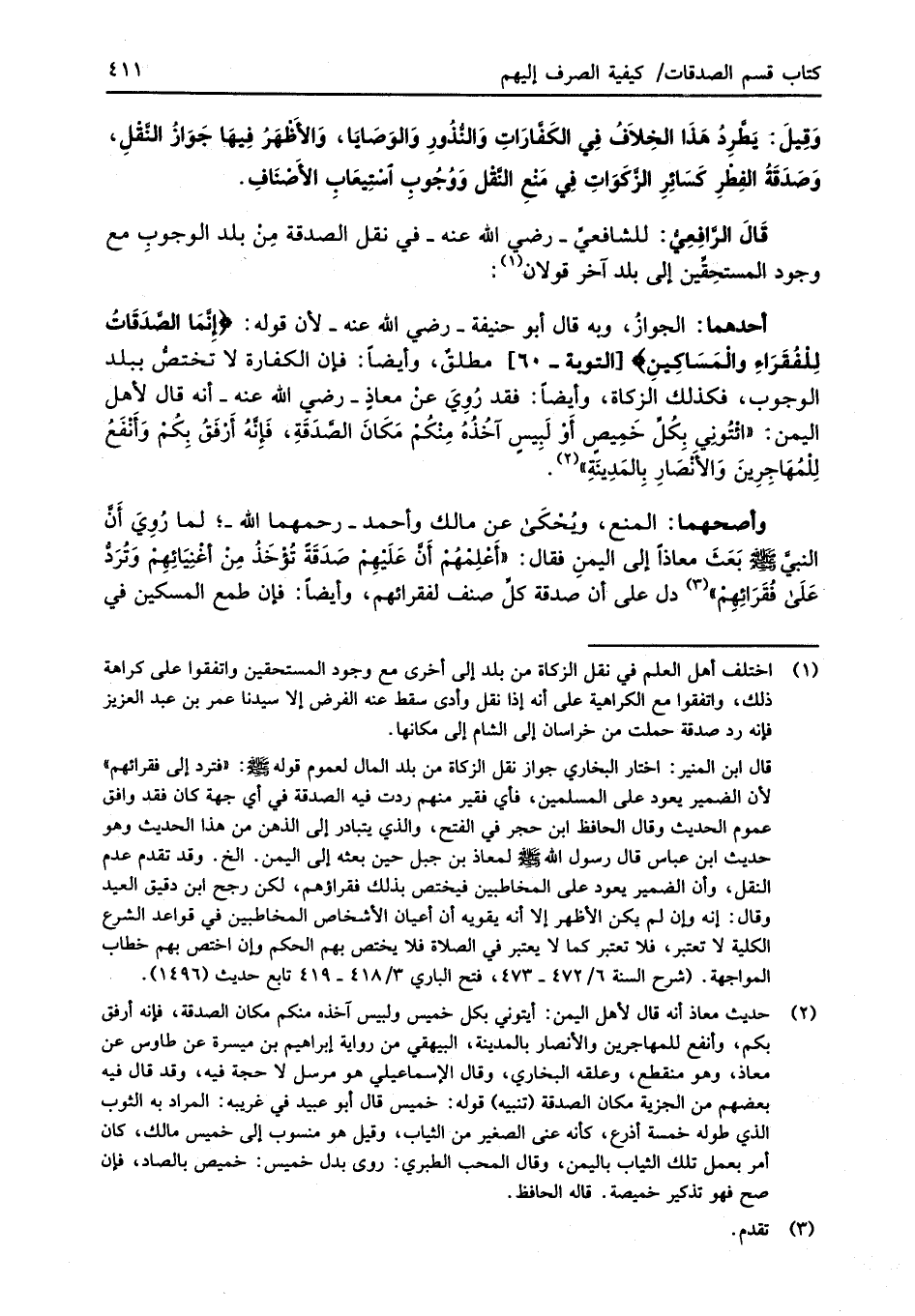 (¬1) اختلف أهل العلم في نقل الزكاة من بلد إلى أخرى مع وجود المستحقين واتفقوا على كراهة ذلك، واتفقوا مع الكراهية على أنه إذا نقل وأدى سقط عنه الفرض إلا سيدنا عمر بن عبد العزيز فإنه رد صدقة حملت من خراسان إلى الشام إلى مكانها.