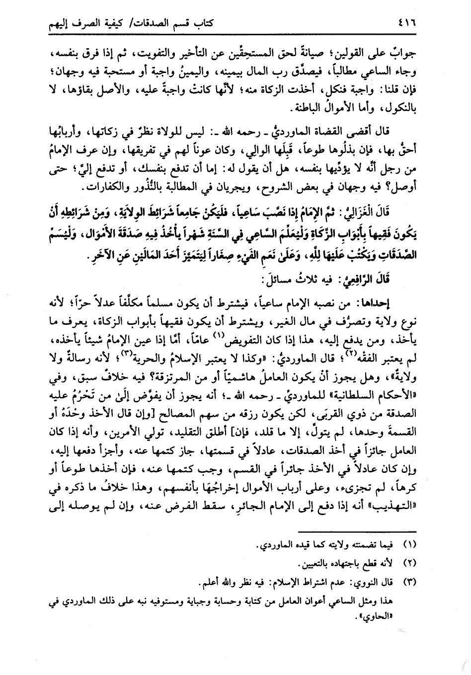 قال أقضى القضاة الماورديُّ -رحمه الله-: ليس للولاة نظرٌ في زكاتها، وأربابُها أحقُّ بها، فإن بذلُوها طوعاً، قَبِلَها الوالِي، وكان عوناً لهم في تفريقها، وإن عرف الإمامُ من رجل أنَّه لا يؤدِّيها بنفسه، هل أن يقول له: إما أن تدفع بنفسك، أو تدفع إليَّ؛ حتى أوصل؟ فيه وجهان في بعض الشروح، ويجريان في المطالبة بالنُّذُور والكفارات.